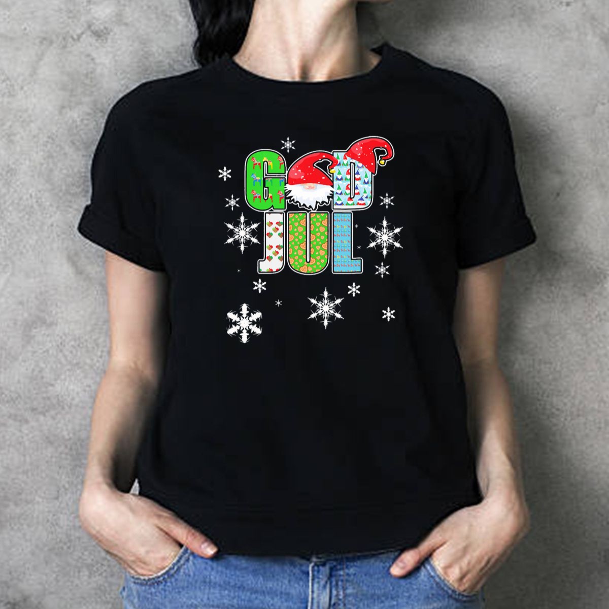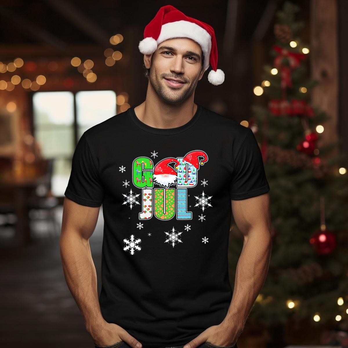 Celebrate the holiday season in style with our God Jul Swedish Merry Christmas T-shirt! Featuring festive snowflakes, a cheerful Santa hat, and playful reindeer ornaments, this shirt is perfect for anyone who loves to embrace the joyful spirit of Christmas. Designed for casual wear, themed events, or just everyday comfort, this fan-made design is printed right here in the USA, making it a unique addition to your holiday wardrobe.