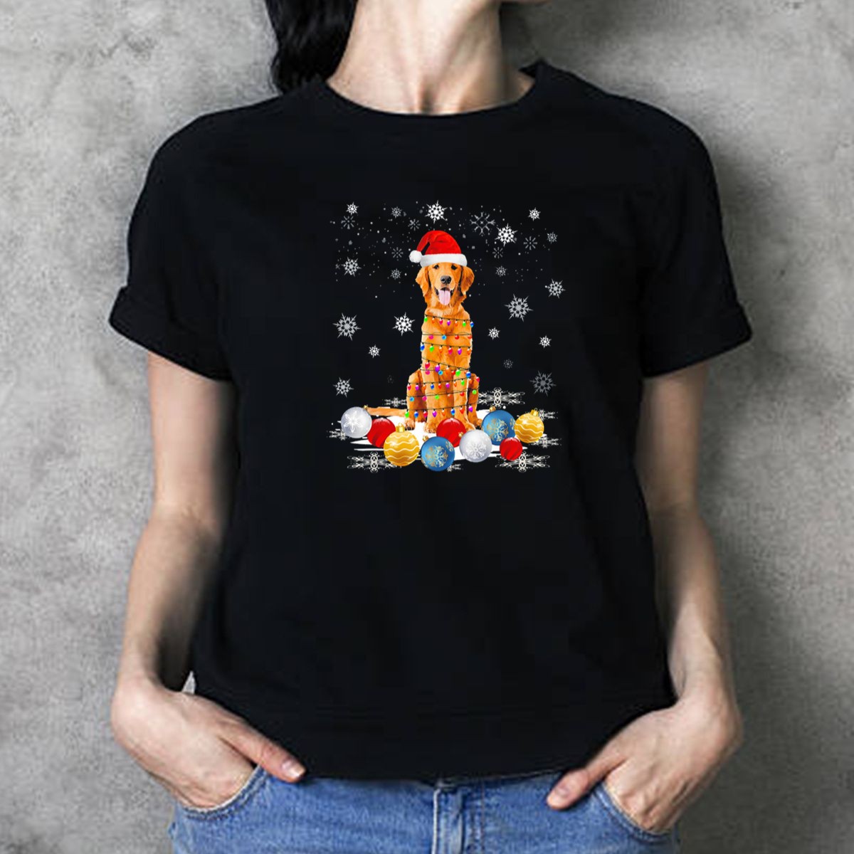 Golden Retriever Dog With Christmas Lights And Santa Hat Surrounded By Snowflakes And Ornaments T-Shirt