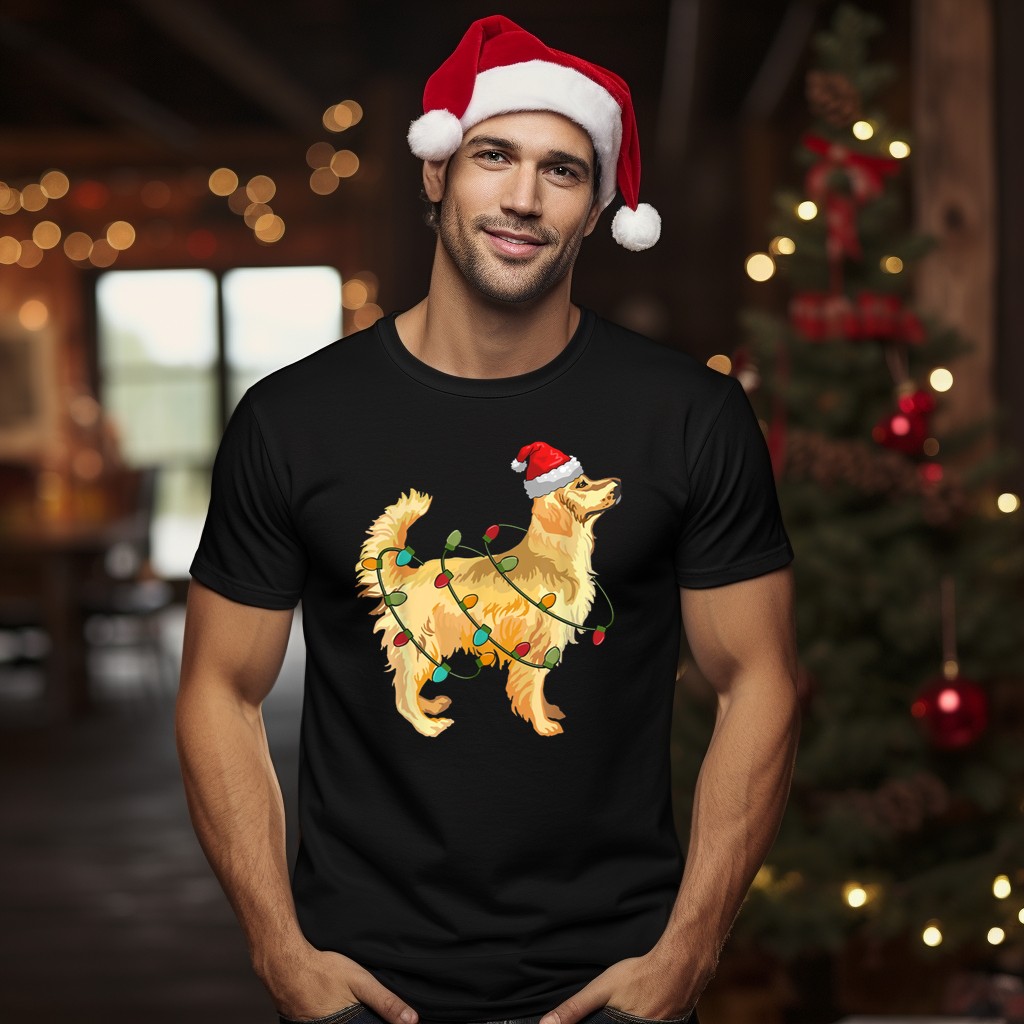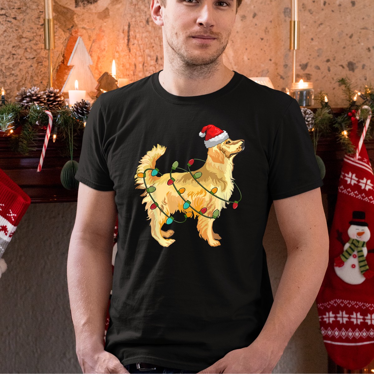 Be the first to review “Golden Retriever Wrapped In Christmas Lights Santa Hat T-Shirt”