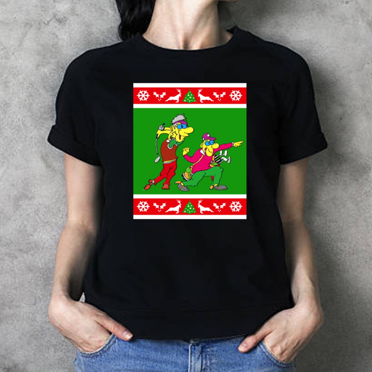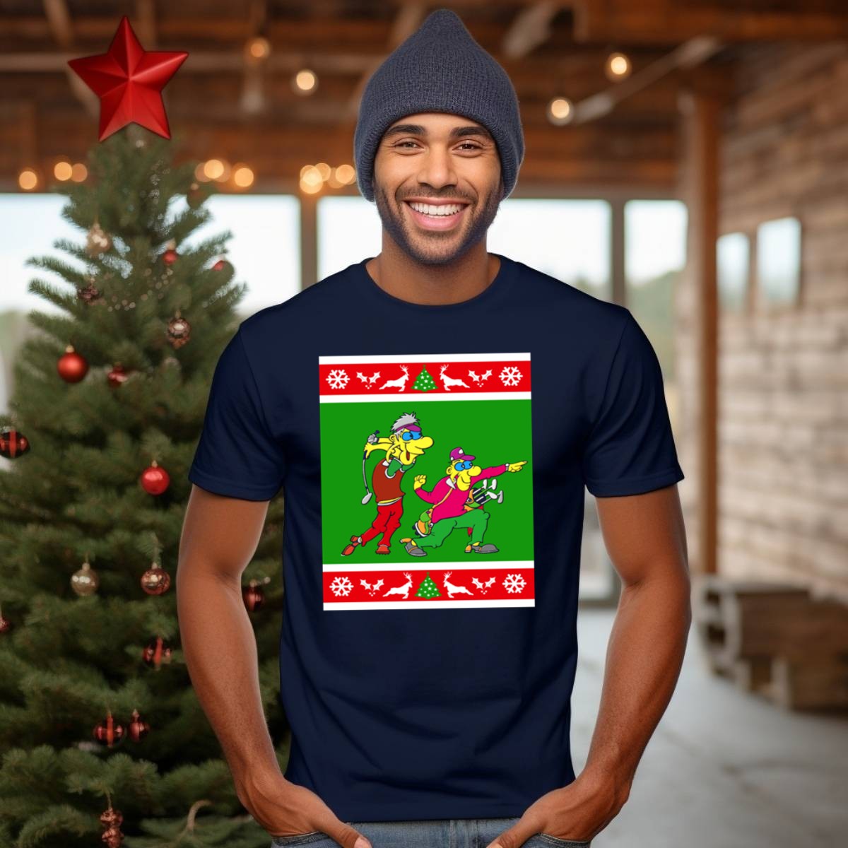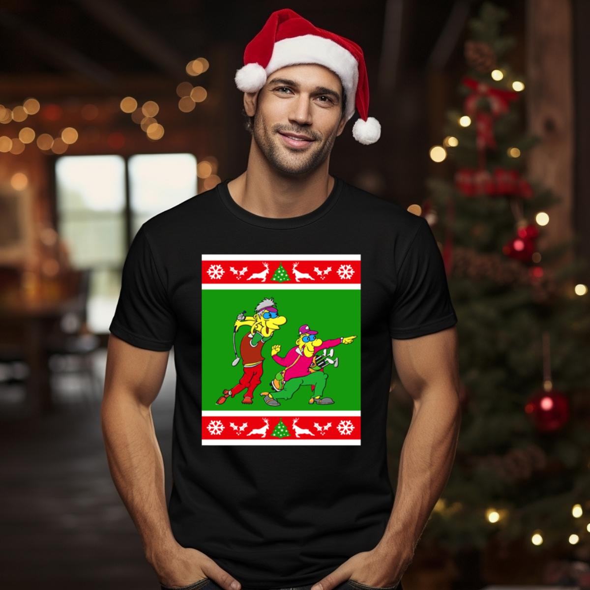 Get ready to spread holiday cheer on the golf course with our Golfer Present Ugly Christmas Golf Cartoons T-Shirt! Perfect for golf enthusiasts who love to celebrate the festive season, this fun and quirky design features playful cartoon graphics of snowflakes, reindeer, and trees. Whether you’re hitting the greens, attending a themed event, or just enjoying casual daily wear, this shirt is sure to bring smiles and laughter to everyone around you. Made with care in the USA, it’s a unique fan-made creation that combines comfort and holiday spirit.