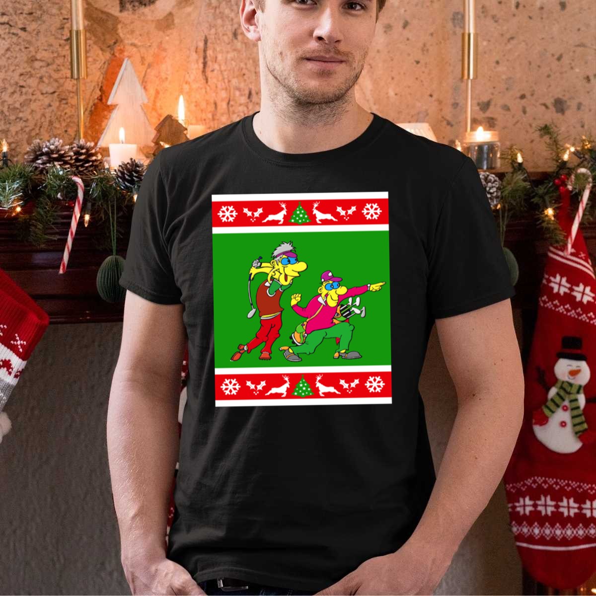 Be the first to review “Golfer Present Ugly Christmas Golf Cartoons Snowflakes Reindeer Trees T Shirt”