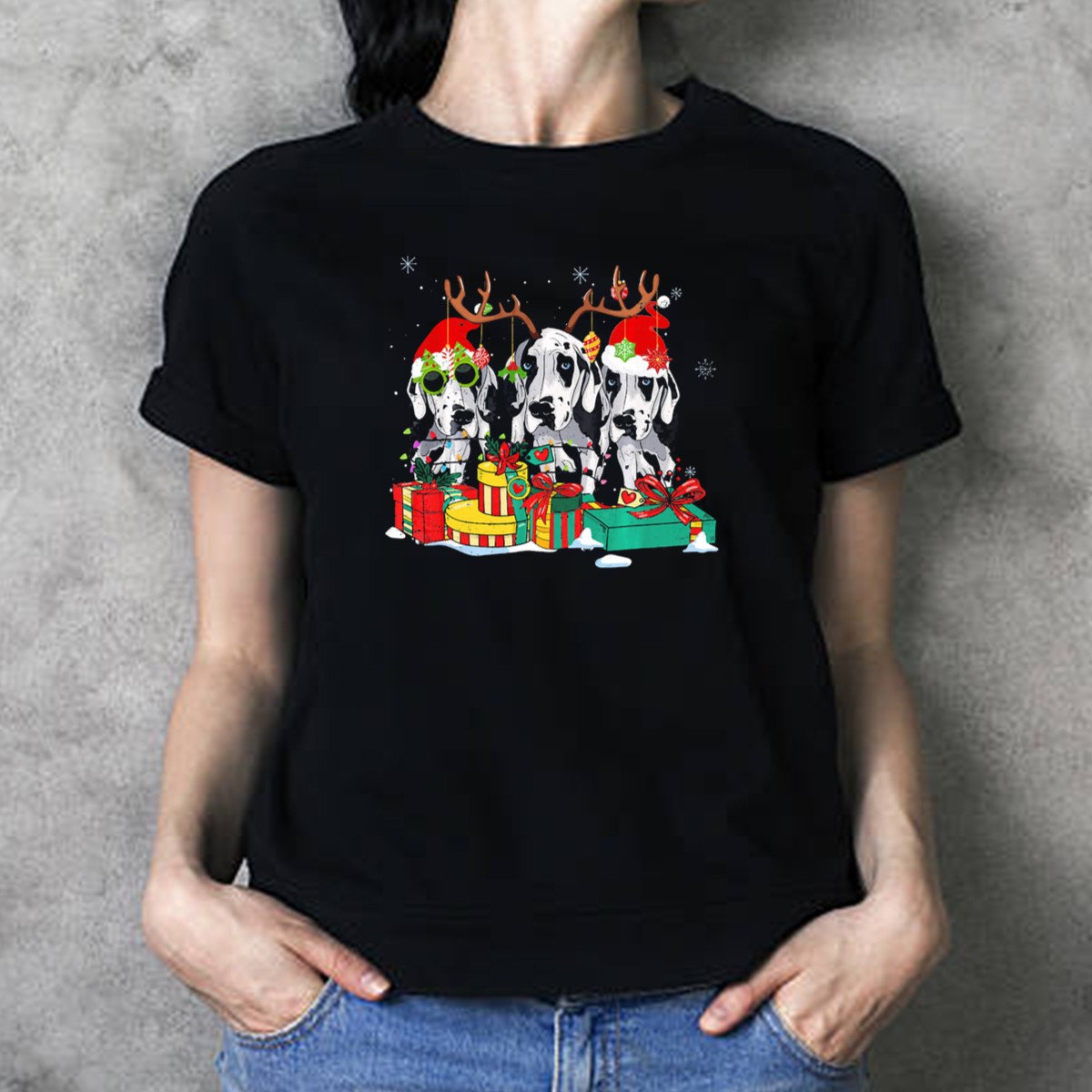 Celebrate the holiday season with our Great Dane Christmas T-Shirt, featuring an adorable design of Santa hats, reindeer antlers, snowflakes, and presents that any dog lover will cherish. Perfect for casual wear or themed events, this shirt is designed for those who want to spread festive cheer while showcasing their love for Great Danes. Made for comfort and style, this fan-made design is printed in the USA, making it a unique addition to your holiday wardrobe.
