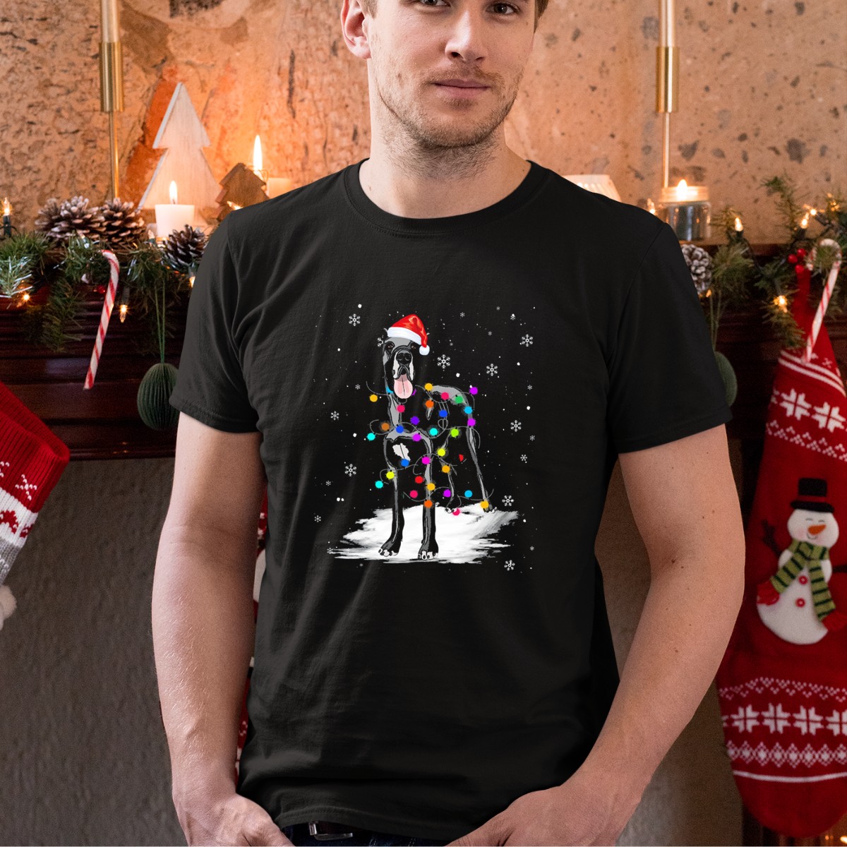 Celebrate the festive season with our Great Dane With Christmas Lights Snowflakes Santa Hat T-Shirt! Perfect for dog lovers who want to spread holiday cheer, this fun and vibrant design captures the spirit of Christmas in a playful way. Ideal for casual gatherings, themed events, or just lounging around during the holidays, this shirt is a must-have addition to your winter wardrobe. Stand out in comfort and style while showcasing your love for Great Danes and all things merry!