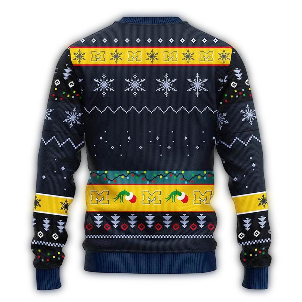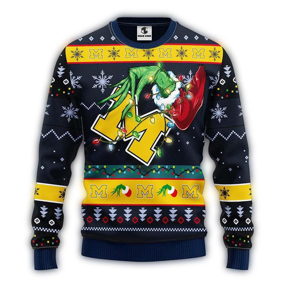 Get ready to spread some holiday cheer with our Grinch Hold Logo Michigan Wolverines Light Christmas Ugly Sweater! Perfect for die-hard Wolverines fans, this sweater is ideal for festive parties, cozy nights at home, or any casual winter outing. Its unique design combines the mischievous spirit of the Grinch with your favorite team, making it a must-have for both style and team pride.