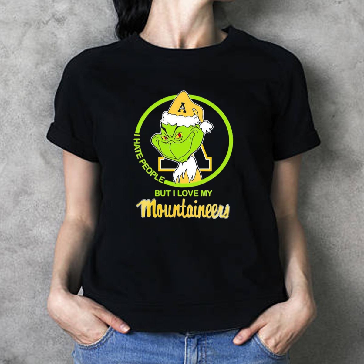 Get ready to spread some holiday cheer with our Grinch I Hate People But I Love My Appalachian State Mountaineers Christmas T-Shirt! Perfect for fans of the Mountaineers who also appreciate a good laugh, this shirt is ideal for casual outings, themed events, or just lounging around during the festive season. Made for those who want to showcase their team spirit with a humorous twist, this fan-made design is proudly printed in the USA, making it a unique addition to your wardrobe.