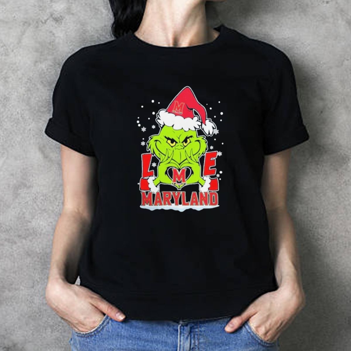 Show your love for the Maryland Terrapins this holiday season with our Grinch Love Maryland Terrapins Football Christmas T-Shirt! Perfect for fans of all ages, this shirt is designed for comfortable casual wear during festive gatherings, themed events, or simply while cheering on your favorite team. The unique fan-made design, printed right here in the USA, brings together the whimsical spirit of the Grinch and the pride of Terps football, making it a must-have for every true fan.
