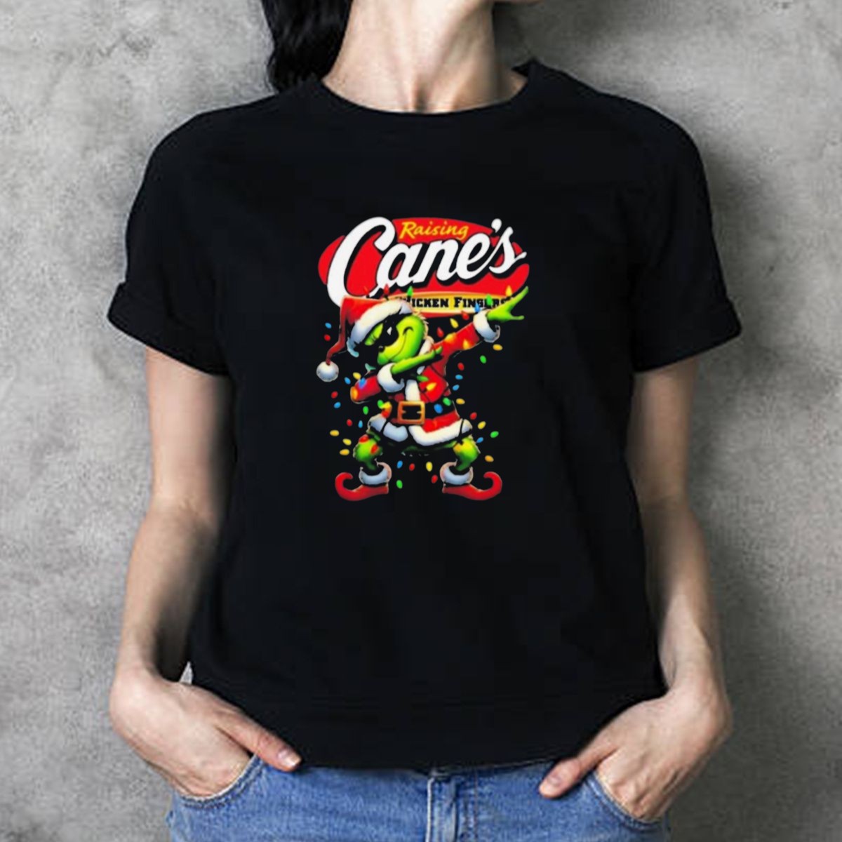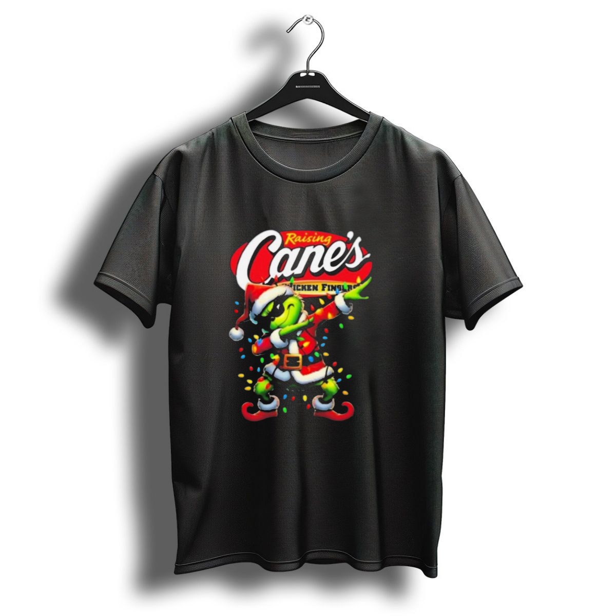 Get into the holiday spirit with our Grinch Santa Dabbing Raising Canes Chicken Fingers T-Shirt! Perfect for fans of festive fun and delicious fast food, this shirt is an ideal choice for casual get-togethers, themed events, or just lounging around during the holiday season. With its eye-catching design printed in the USA, this unique tee is sure to be a conversation starter at any gathering!