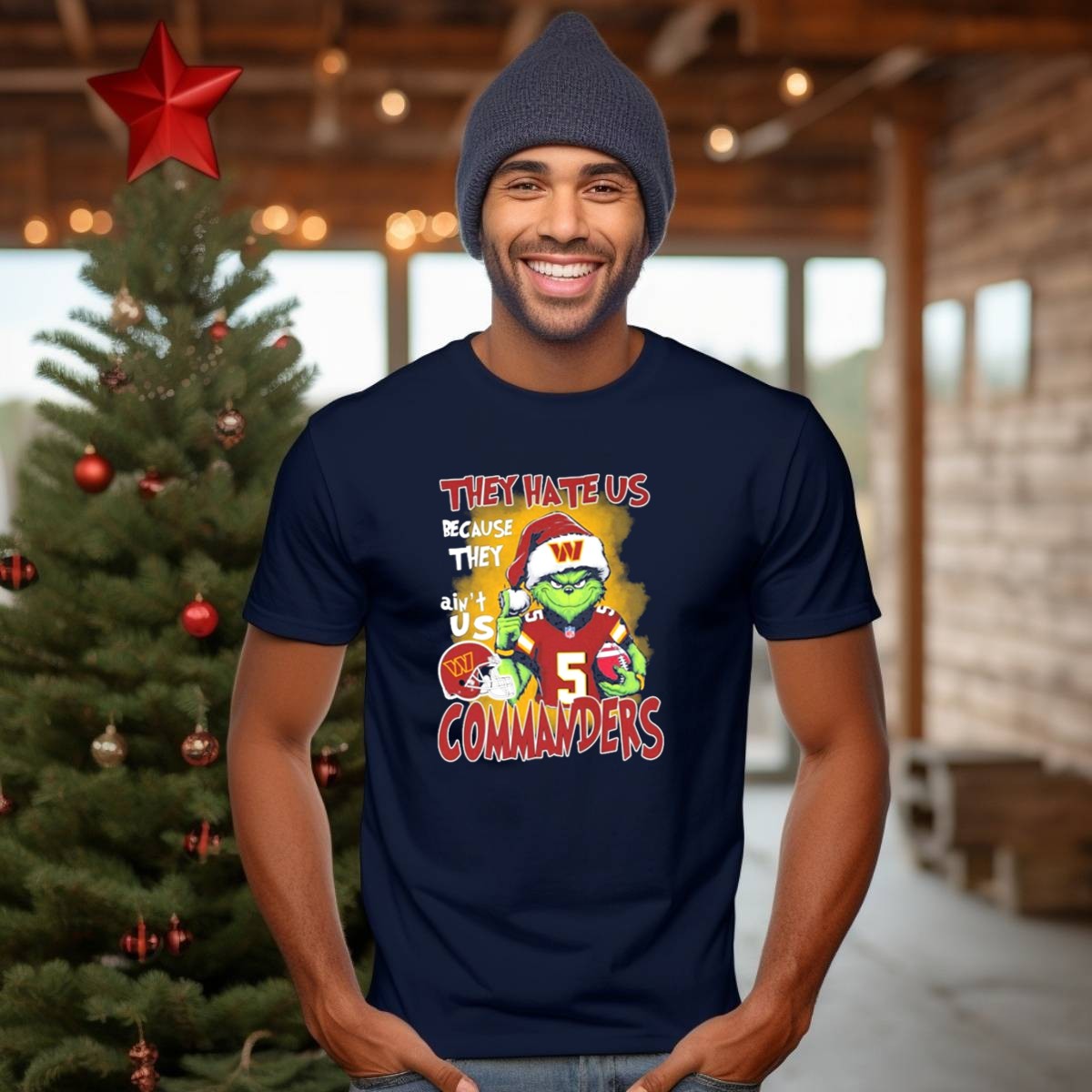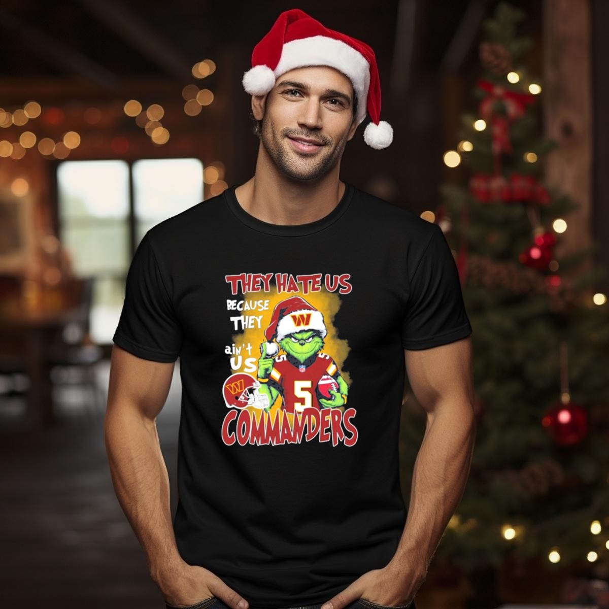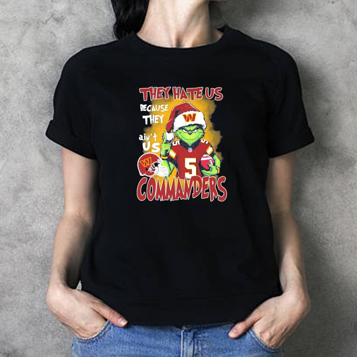 Celebrate the holiday season with a twist of football spirit in our Grinch Washington Commanders Christmas “They Hate Us Because They Ain’t Us” T-shirt! Perfect for die-hard fans, this fun and festive shirt is ideal for casual gatherings, themed events, or daily wear during the holidays. Crafted for comfort and style, it features a fan-made design that showcases your team pride in a unique way, making it a must-have for any Commanders supporter!