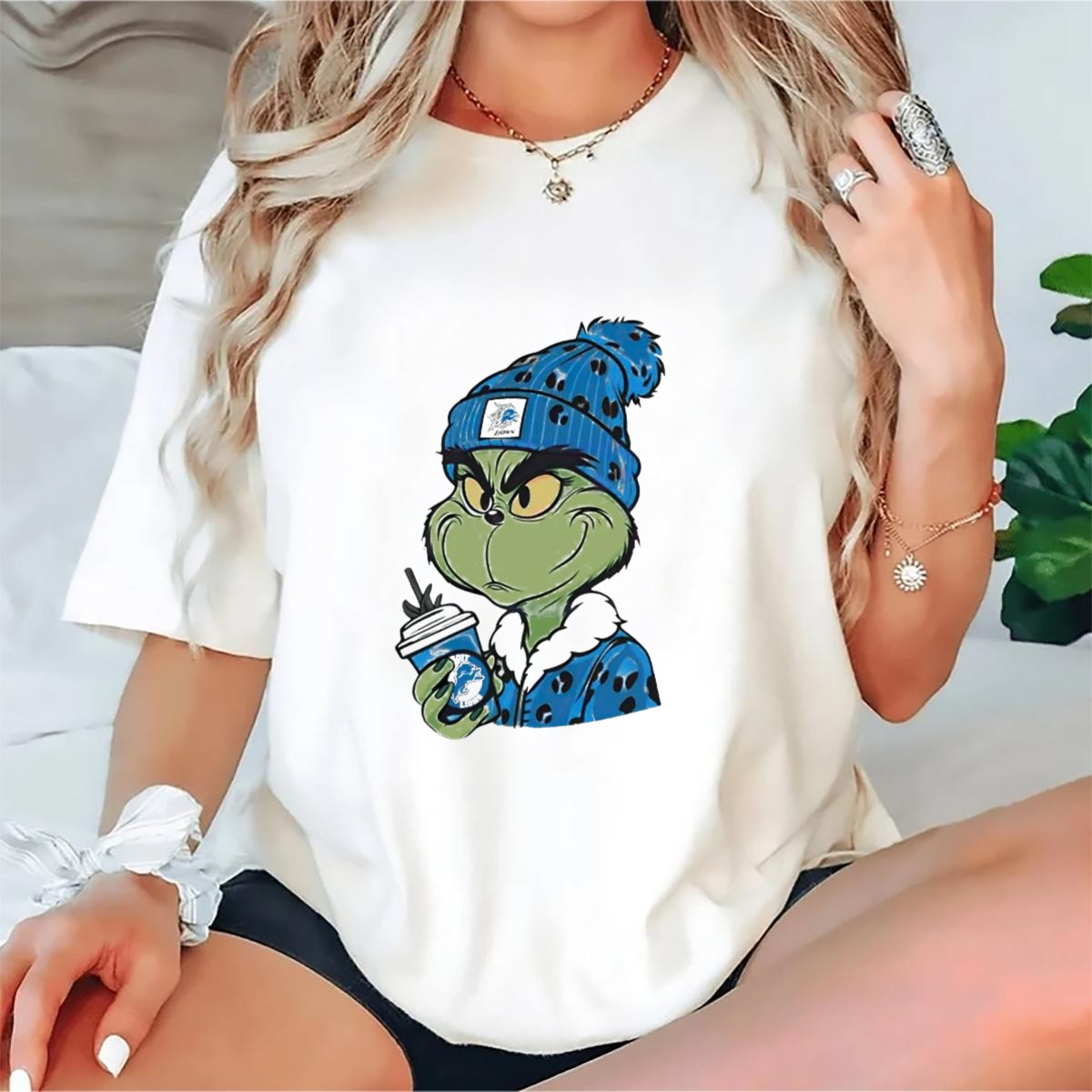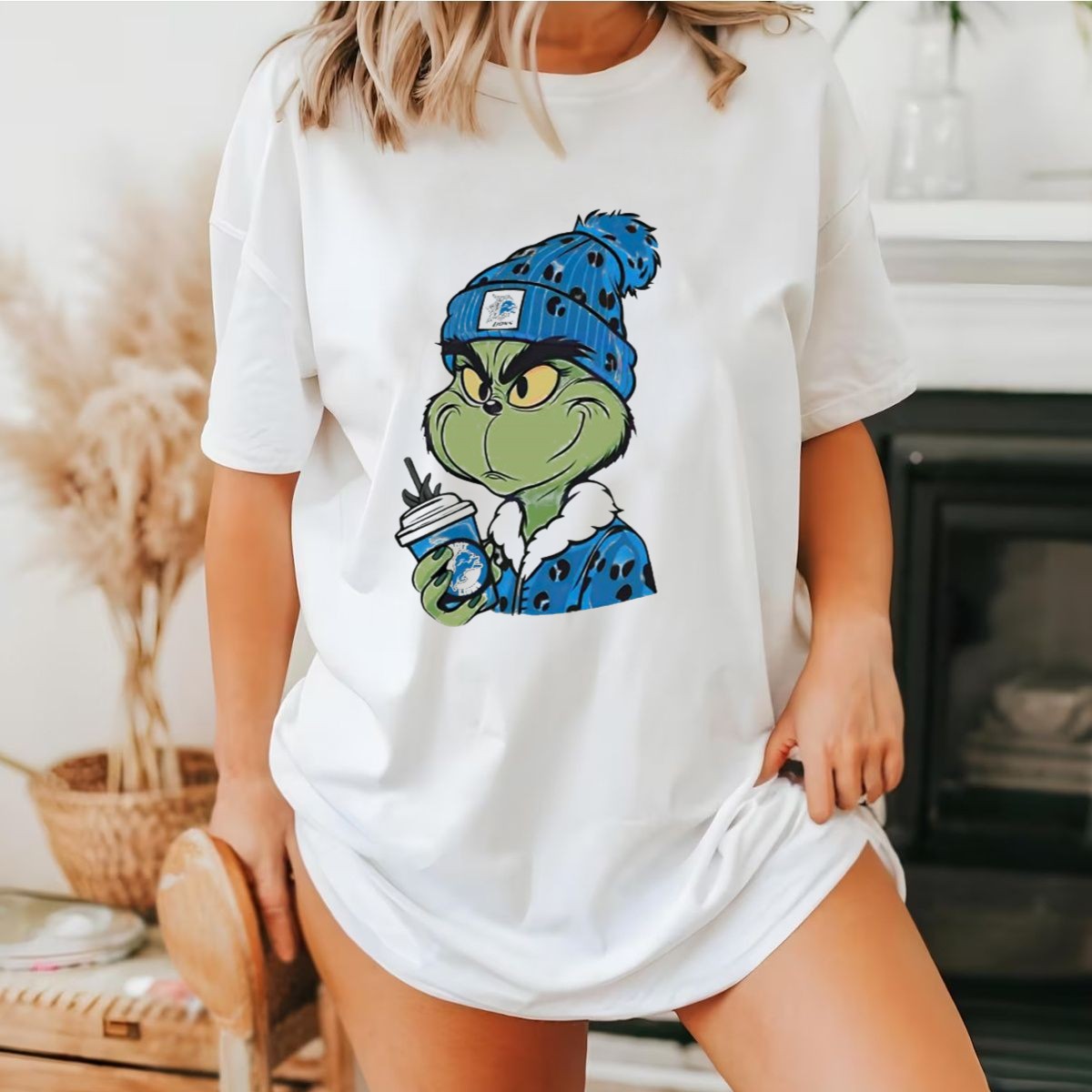 Celebrate the holiday season with our Grinch Wearing Detroit Lions Winter Outfit Holding Drink Christmas T-Shirt! This fun and festive tee is perfect for fans of the Grinch and the Detroit Lions alike, making it an ideal choice for casual wear, themed events, or simply spreading Christmas cheer. Crafted with a unique fan-made design and printed right here in the USA, this shirt combines comfort and style, ensuring you’ll be the center of attention at any gathering.