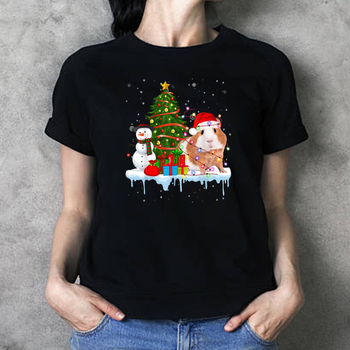 Celebrate the holiday season with our whimsical Guinea Pig Santa Hat Christmas Lights Snowman Tree Gifts T-Shirt! Perfect for animal lovers and festive spirits alike, this fun graphic tee is ideal for casual gatherings, themed events, or simply spreading cheer during daily wear. Made with care in the USA, this fan-made design is sure to bring smiles and warmth, making it a unique addition to your holiday wardrobe.