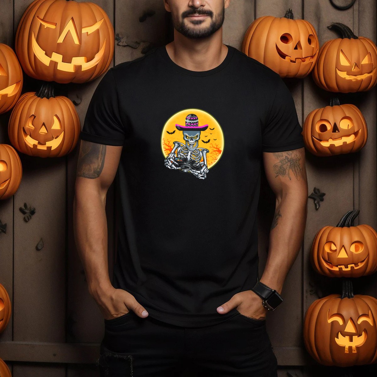 Embrace the spirit of Halloween with our Gamer Skeleton T-Shirt, designed for those who love gaming and festive fun! This fan-made design features a playful skeleton wearing a sombrero, ready to conquer the night with its controller, surrounded by bats and a glowing moon. Perfect for casual outings, themed events, or just lounging around while enjoying your favorite games, this shirt is a must-have for any gaming enthusiast looking to celebrate the season in style.