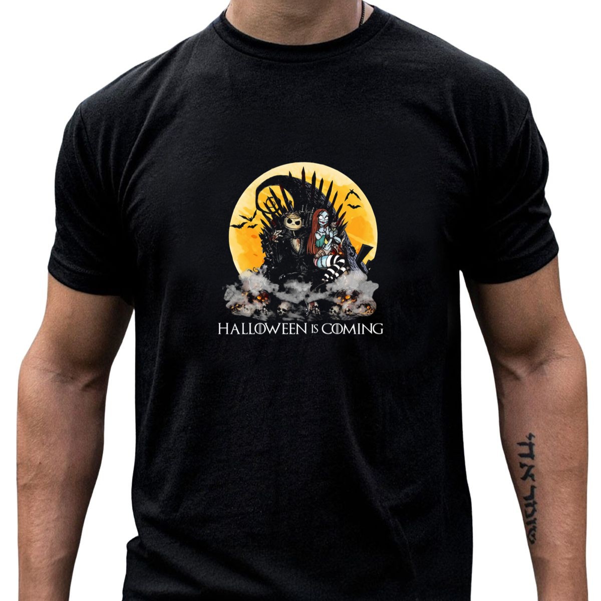 Get ready to embrace the spooky season with our Halloween Is Coming T-Shirt featuring the enigmatic Skeleton King and Gothic Queen on their throne, surrounded by moonlit bats and skulls. This eye-catching graphic tee is perfect for Halloween enthusiasts, making it an ideal choice for casual wear, themed events, or simply showcasing your love for all things gothic. Crafted with a fan-made design printed in the USA, this shirt not only stands out but also offers comfort and style for all your seasonal festivities.