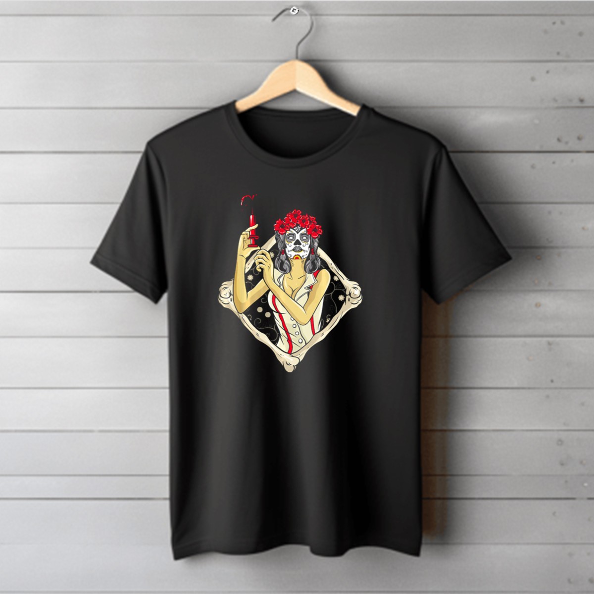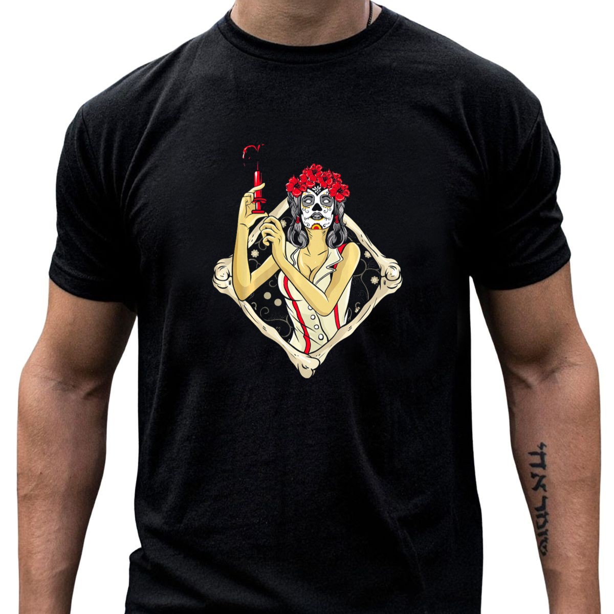 Embrace the spirit of Halloween with our fan-made Dia De Los Muertos Skeleton Syringe Flower Crown T-Shirt, perfect for nurses and anyone who loves to celebrate this vibrant holiday. This unique design showcases a stunning blend of cultural elements, making it an ideal choice for themed events, casual outings, or daily wear. Crafted for comfort and style, this shirt is sure to turn heads and spark conversations wherever you go!
