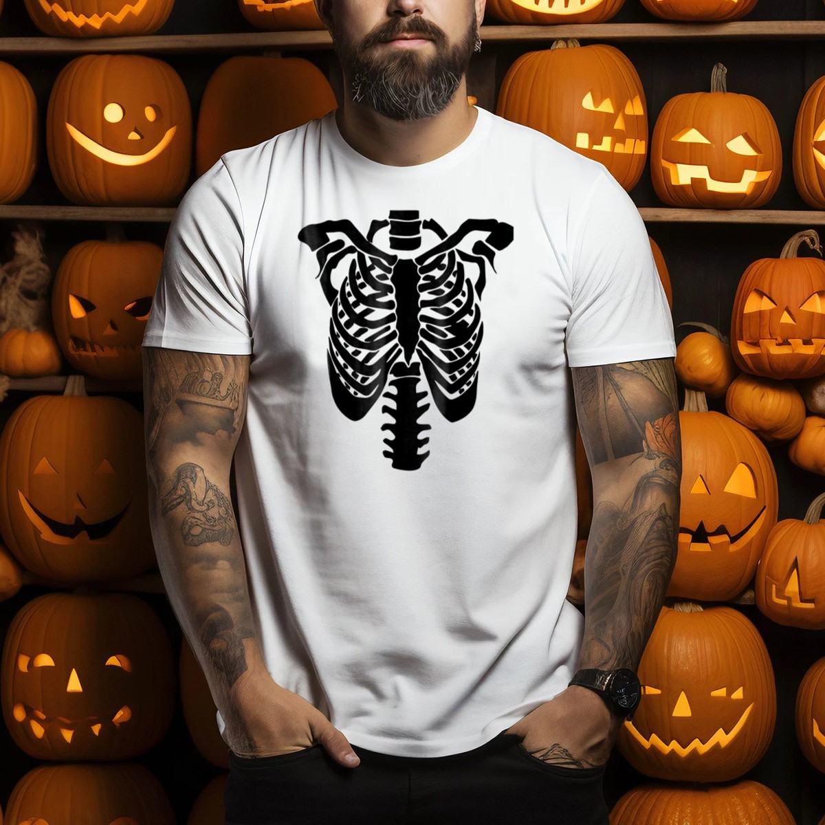 Get ready to make a spine-chilling statement this Halloween with our Halloween Rib Cage Exoskeleton T-Shirt! Perfect for those who love to embrace the spooky season, this shirt is ideal for casual wear, themed events, or just hanging out with friends. The unique fan-made design, printed right here in the USA, will have all eyes on you as you showcase your love for all things eerie and fun.