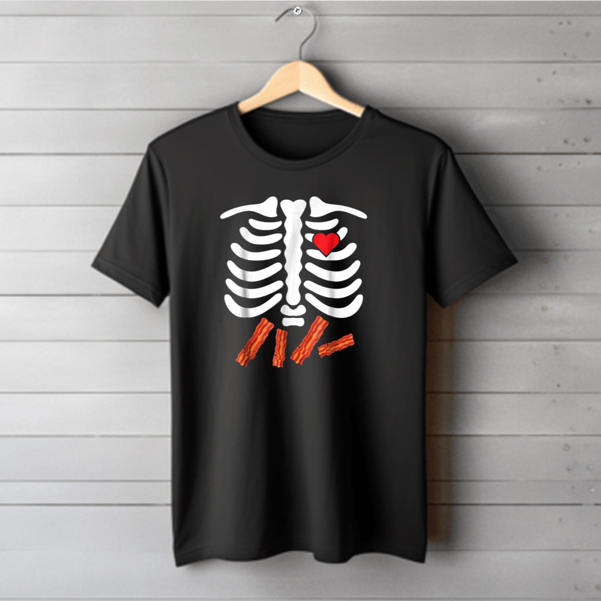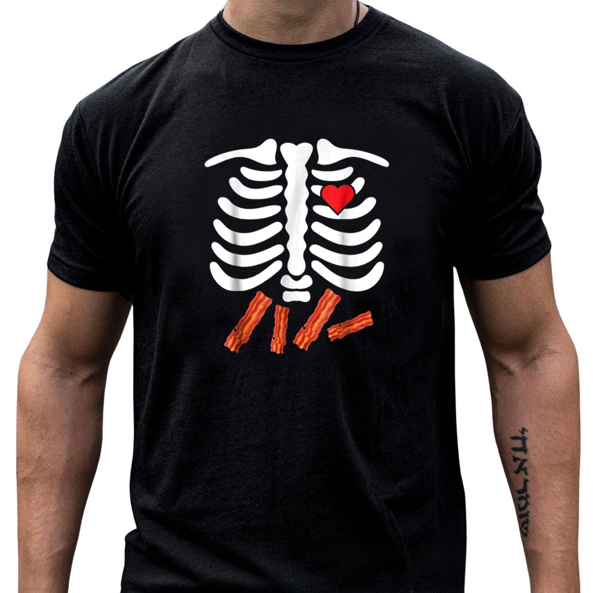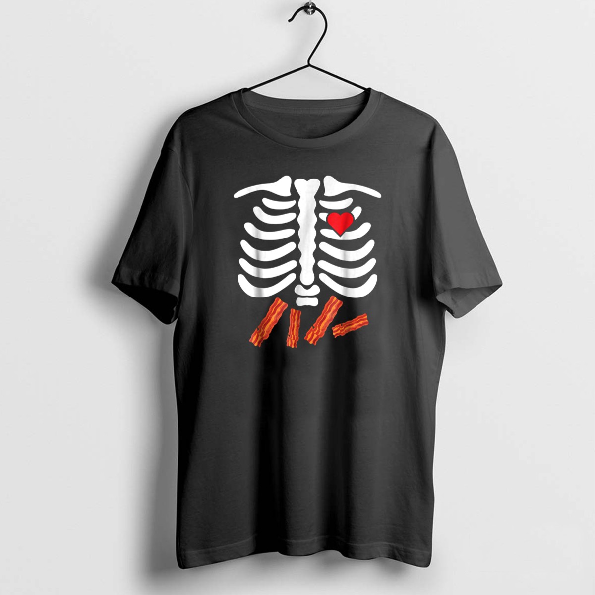 Embrace your love for bacon with a quirky twist this Halloween! Our Halloween Skeleton Bacon Lover Rib Cage Heart Belly T-Shirt is perfect for those who enjoy a fun and unique way to celebrate the spooky season. This fan-made design is ideal for casual wear, themed events, or just lounging around at home. With its soft, breathable fabric and eye-catching print, you’ll stand out while showcasing your favorite food in a playful way.