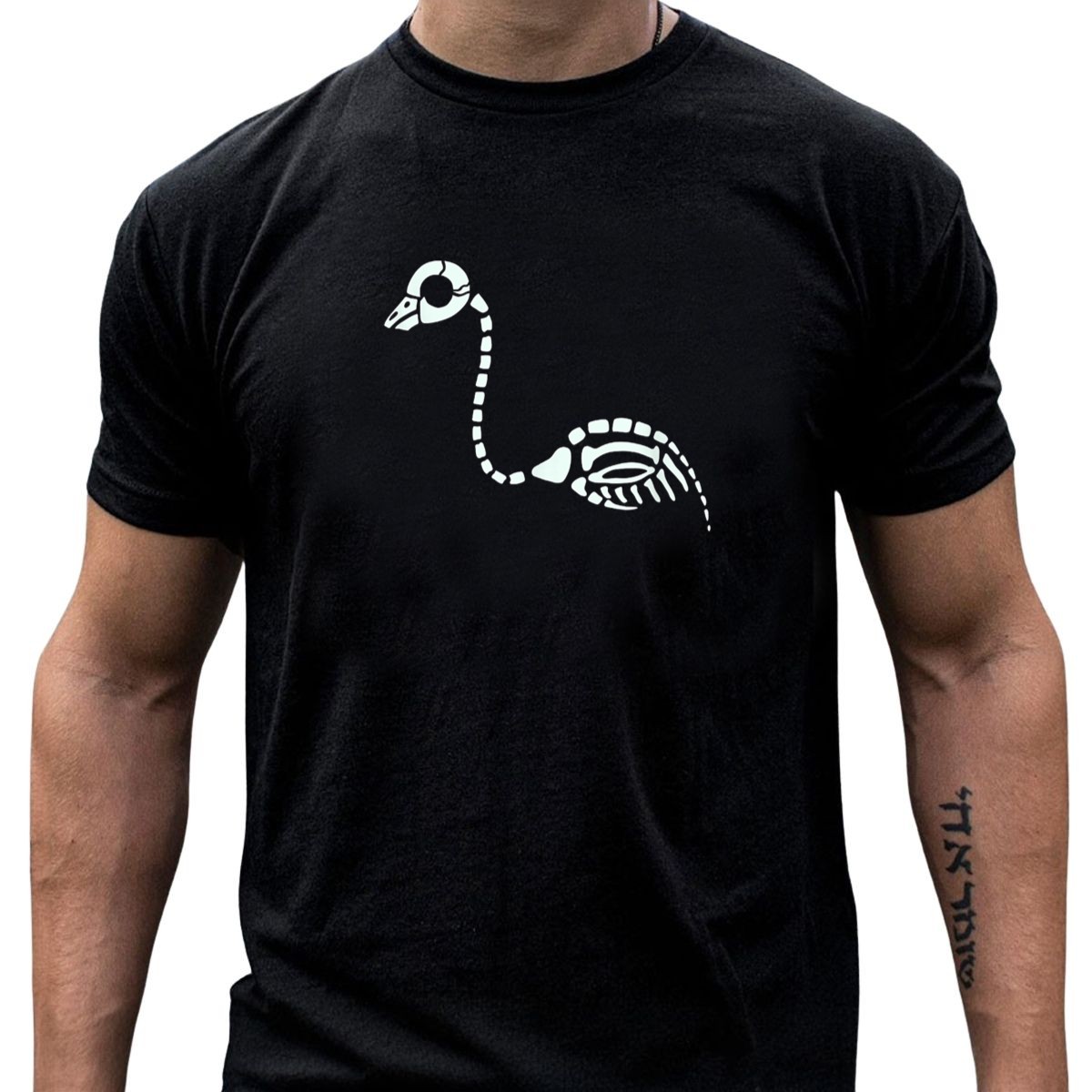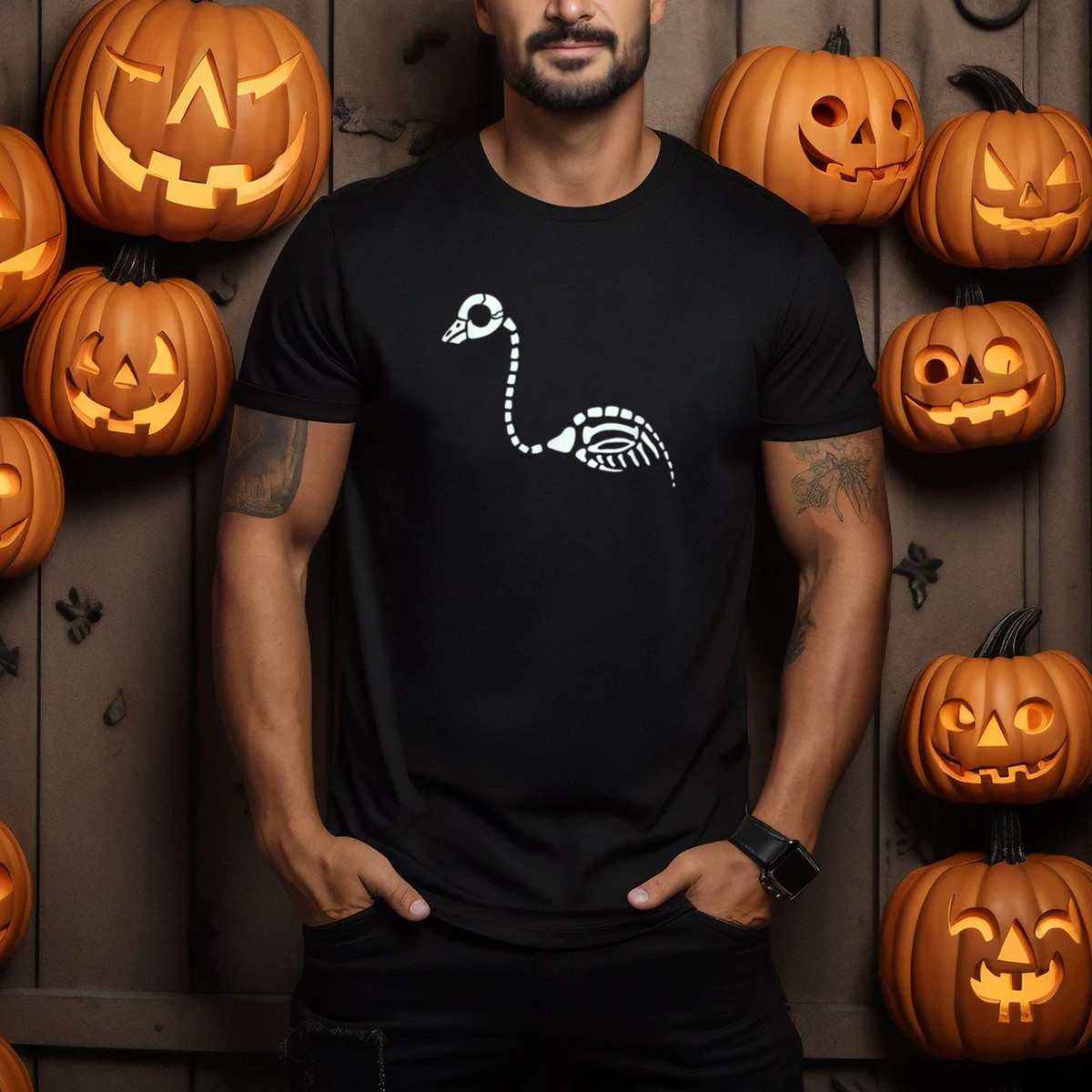 Get ready to stand out this Halloween with our Skeleton Flamingo Glow In The Dark T-Shirt! Perfect for those who love to celebrate the spooky season in style, this shirt is ideal for casual outings, themed parties, or just lounging around. Featuring a unique fan-made design that glows in the dark, this tee is sure to turn heads and add a fun twist to your wardrobe.