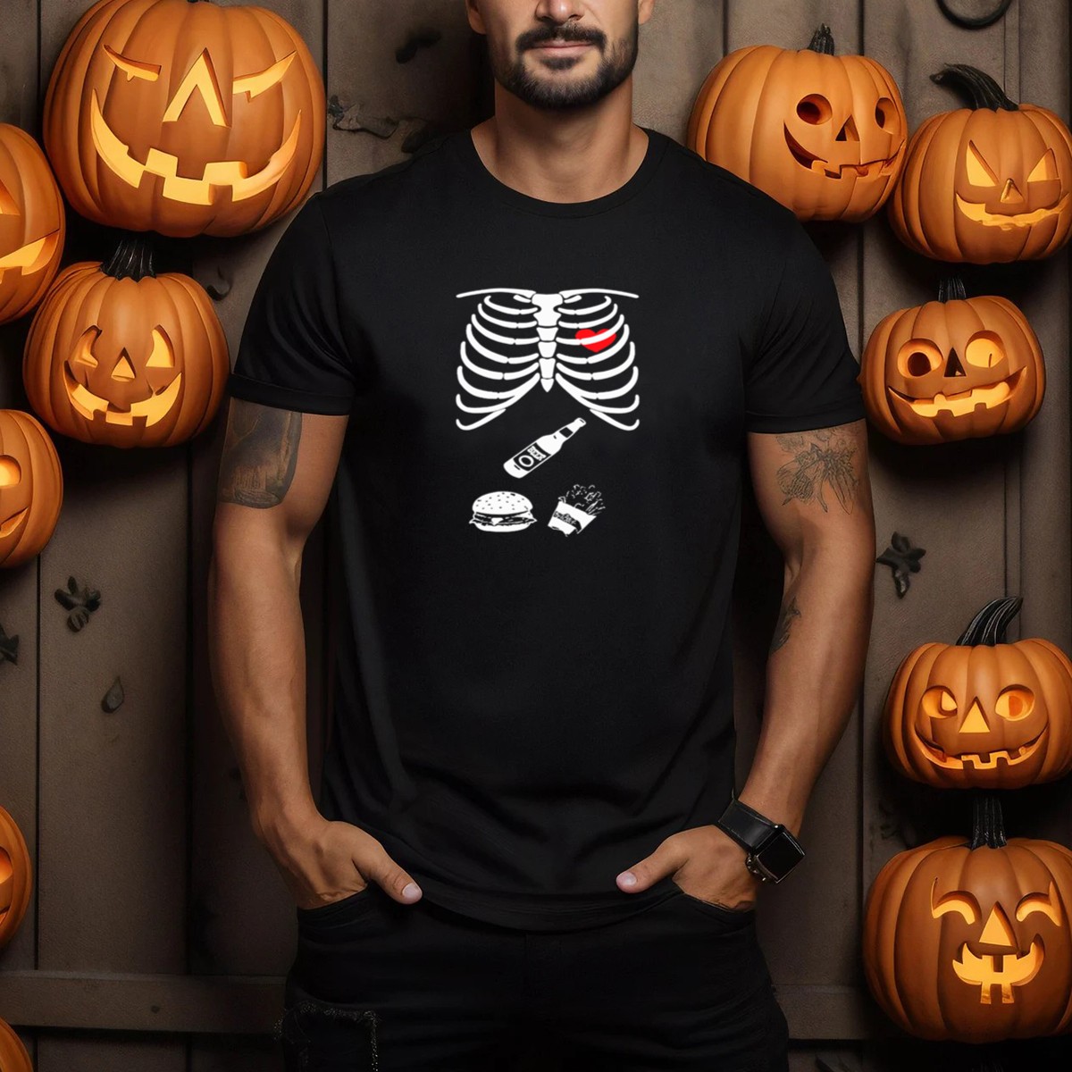 Celebrate Halloween in style with our unique X-Ray Skeleton Heart Burger Drink Fries T-Shirt! Perfect for those who love to stand out at themed events or simply want to add a quirky twist to their daily wear, this fan-made design showcases a playful take on Halloween festivities. Crafted for comfort and style, this shirt is an ideal choice for all-season fun, making it a must-have for casual outings, parties, or just lounging at home.