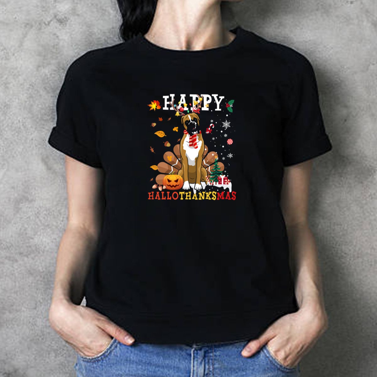 Celebrate the joy of the holiday season with our Happy Hallothanksmas Boxer Dog T-Shirt! Perfect for dog lovers and holiday enthusiasts alike, this playful design combines the spirit of Halloween, Thanksgiving, and Christmas in one fun graphic. Whether you’re attending a themed event, enjoying a casual outing, or simply want to spread some festive cheer in your daily wear, this T-shirt is the ideal choice. Crafted for comfort and style, it’s sure to turn heads and bring smiles wherever you go!