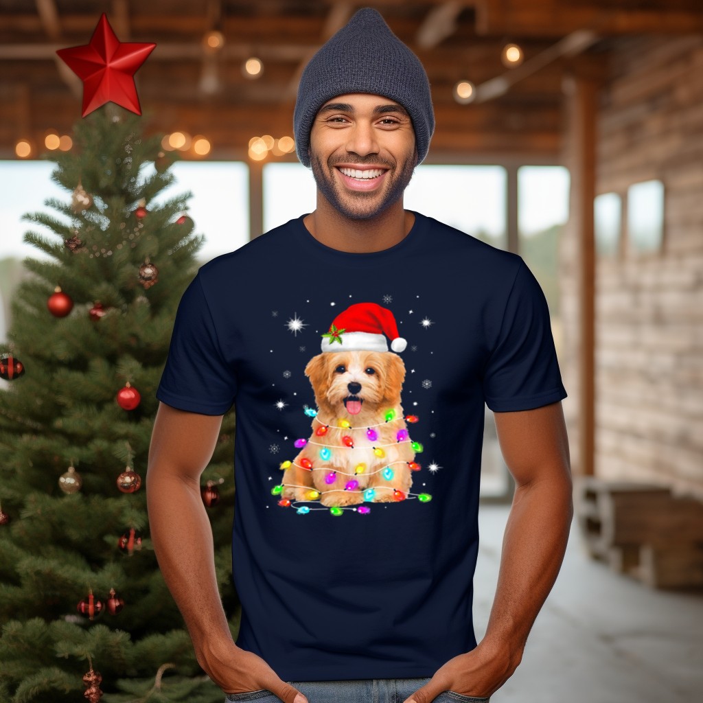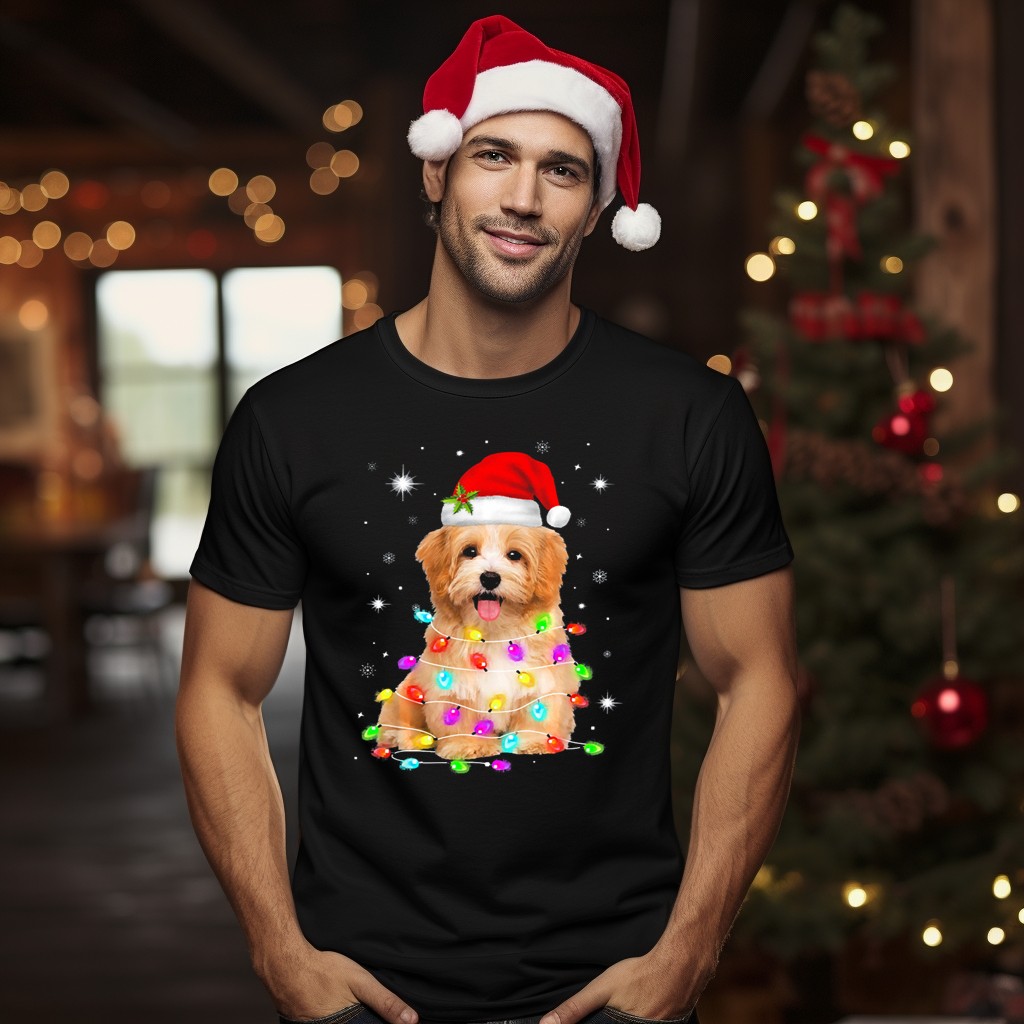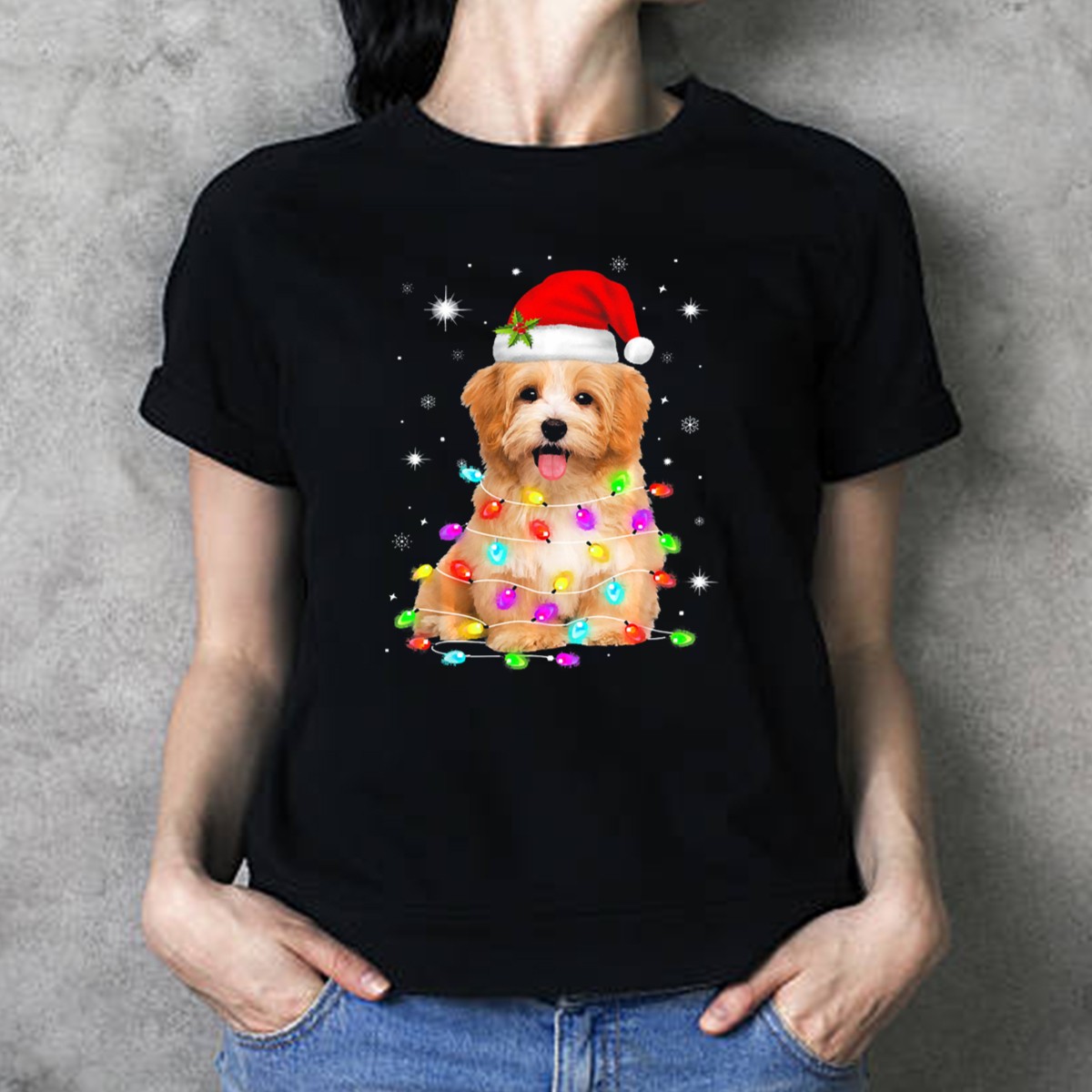 Celebrate the holiday season with our adorable Havanese Puppy Wrapped In Christmas Lights T-Shirt! This festive design features a charming Havanese puppy donning a Santa hat, surrounded by twinkling lights and delicate snowflakes, making it the perfect choice for dog lovers and holiday enthusiasts alike. Ideal for casual outings, themed events, or simply spreading joy during the festive season, this shirt is a unique addition to your winter wardrobe.