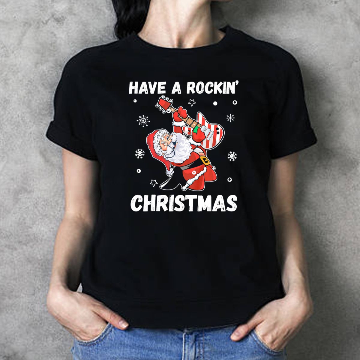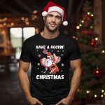 Be the first to review “Have A Rockin Christmas Guitarist Santa With Festive Snowflakes And Stars T Shirt”