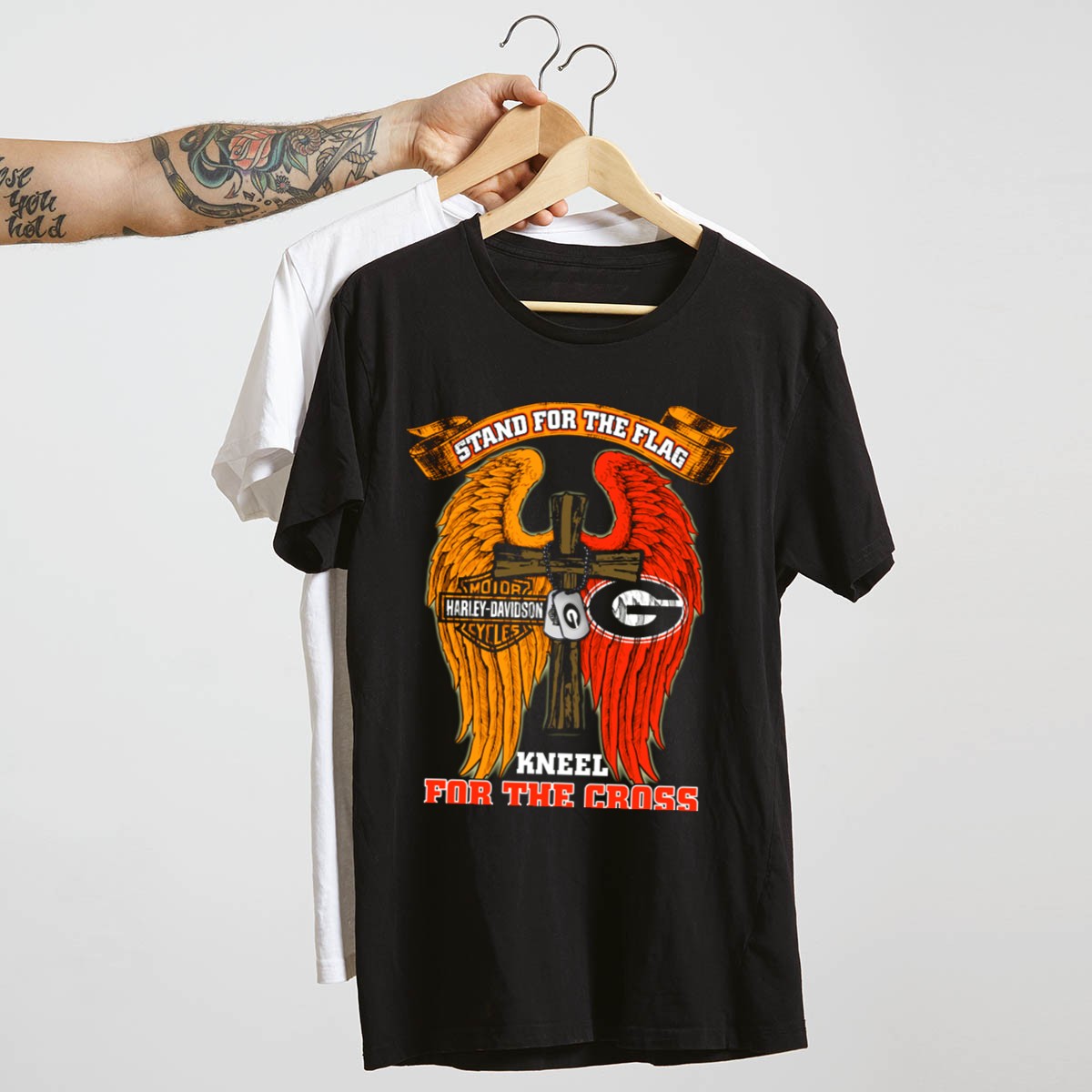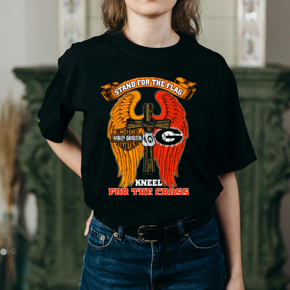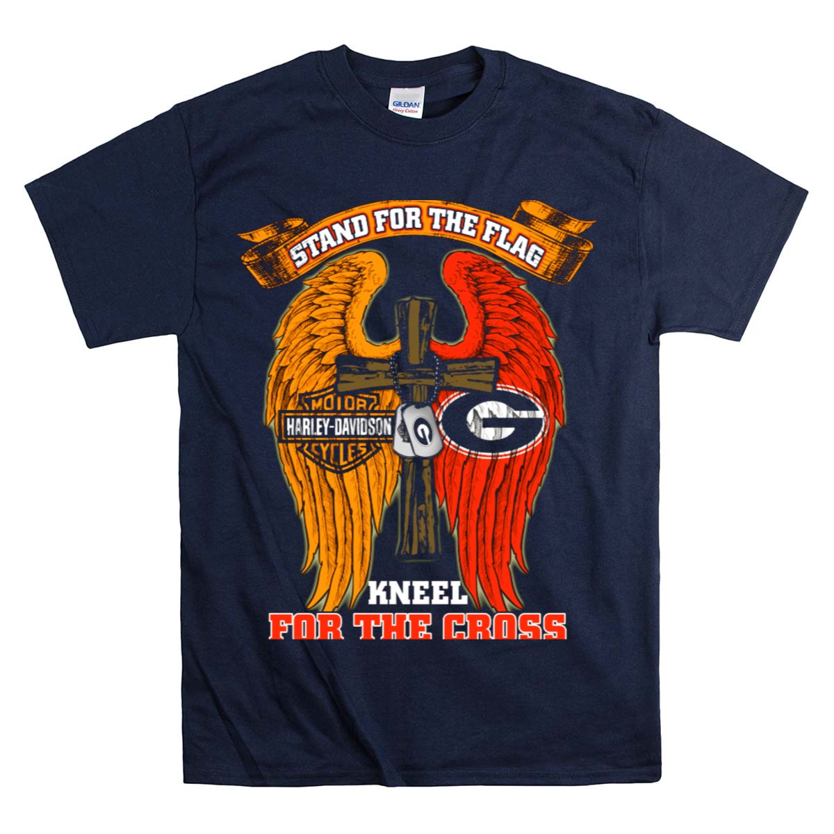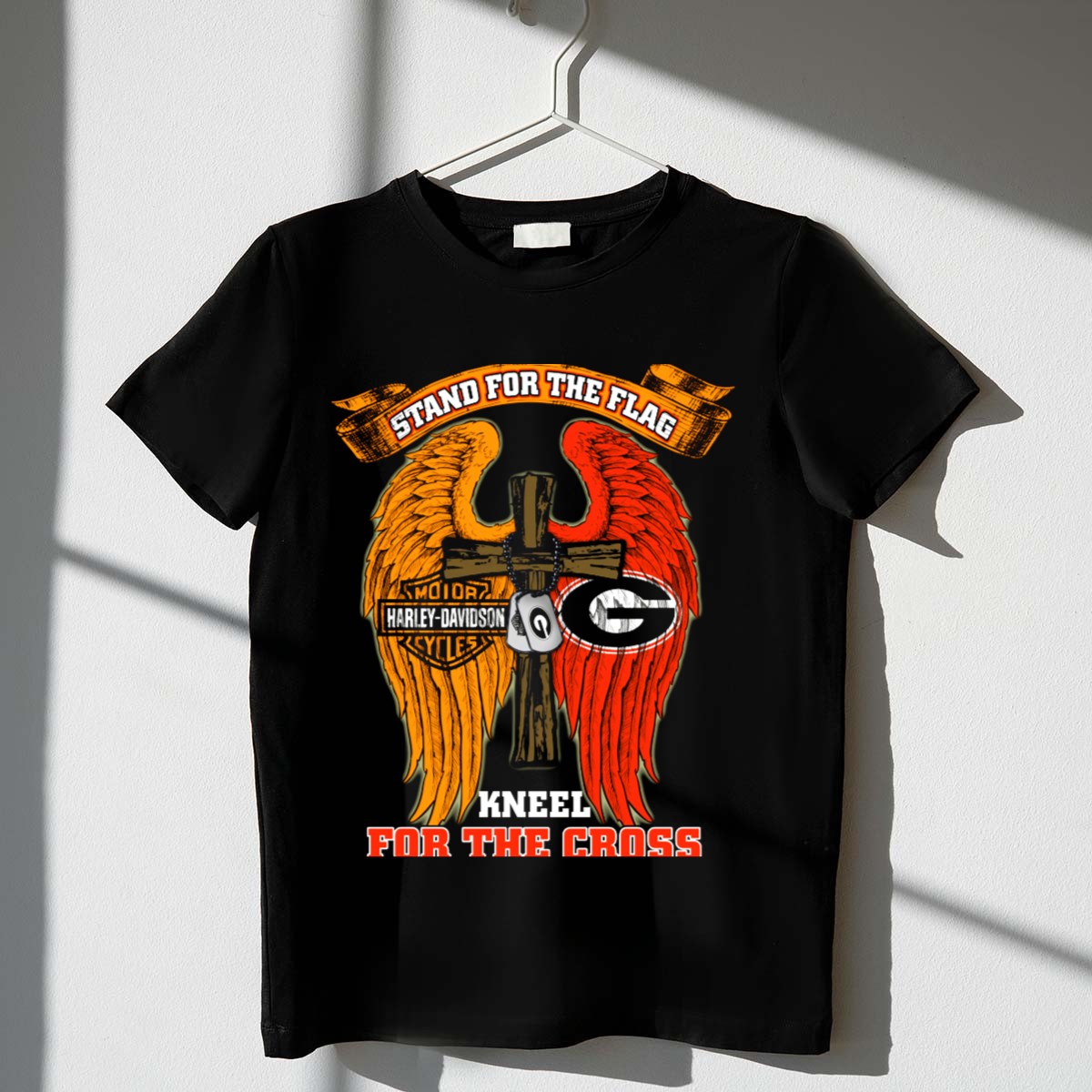 Show your unwavering support for the Georgia Bulldogs with this eye-catching “Stand For The Flag, Kneel For The Cross” T-shirt. Perfect for fans who want to express their pride both on and off the field, this shirt is ideal for casual outings, themed events, or just a relaxed day at home. Crafted for comfort and style, the fan-made design is proudly printed in the USA, making it a unique addition to your wardrobe.
