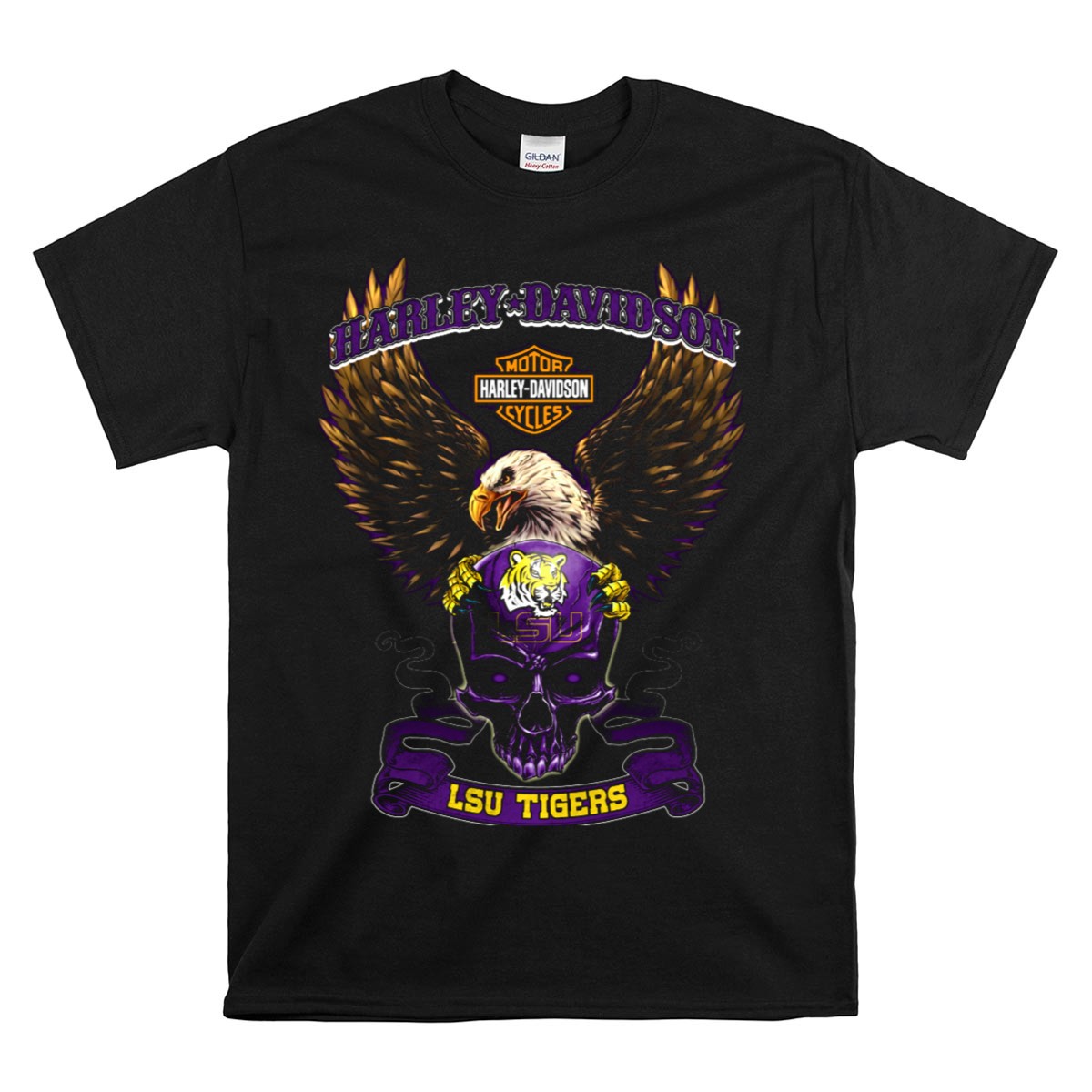 Unleash your inner tiger with our HD LSU Tigers Motor Cycles Eagle Skull T-Shirt! Perfect for fans of the fierce LSU spirit, this shirt combines edgy design with comfortable style. Whether you’re at a game, a themed event, or just out and about, this unique fan-made design, proudly printed in the USA, will make you stand out in any crowd. Show off your passion for the Tigers while enjoying the classic fit that keeps you comfortable all day long.