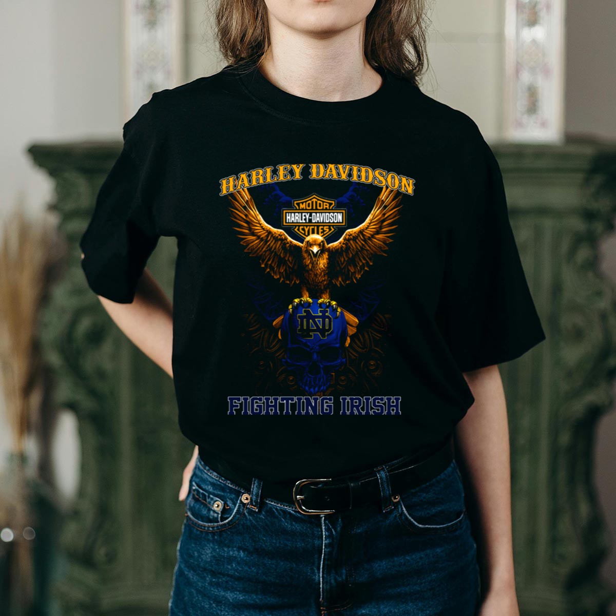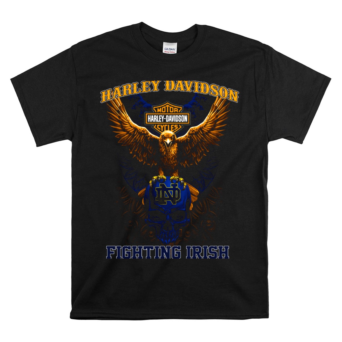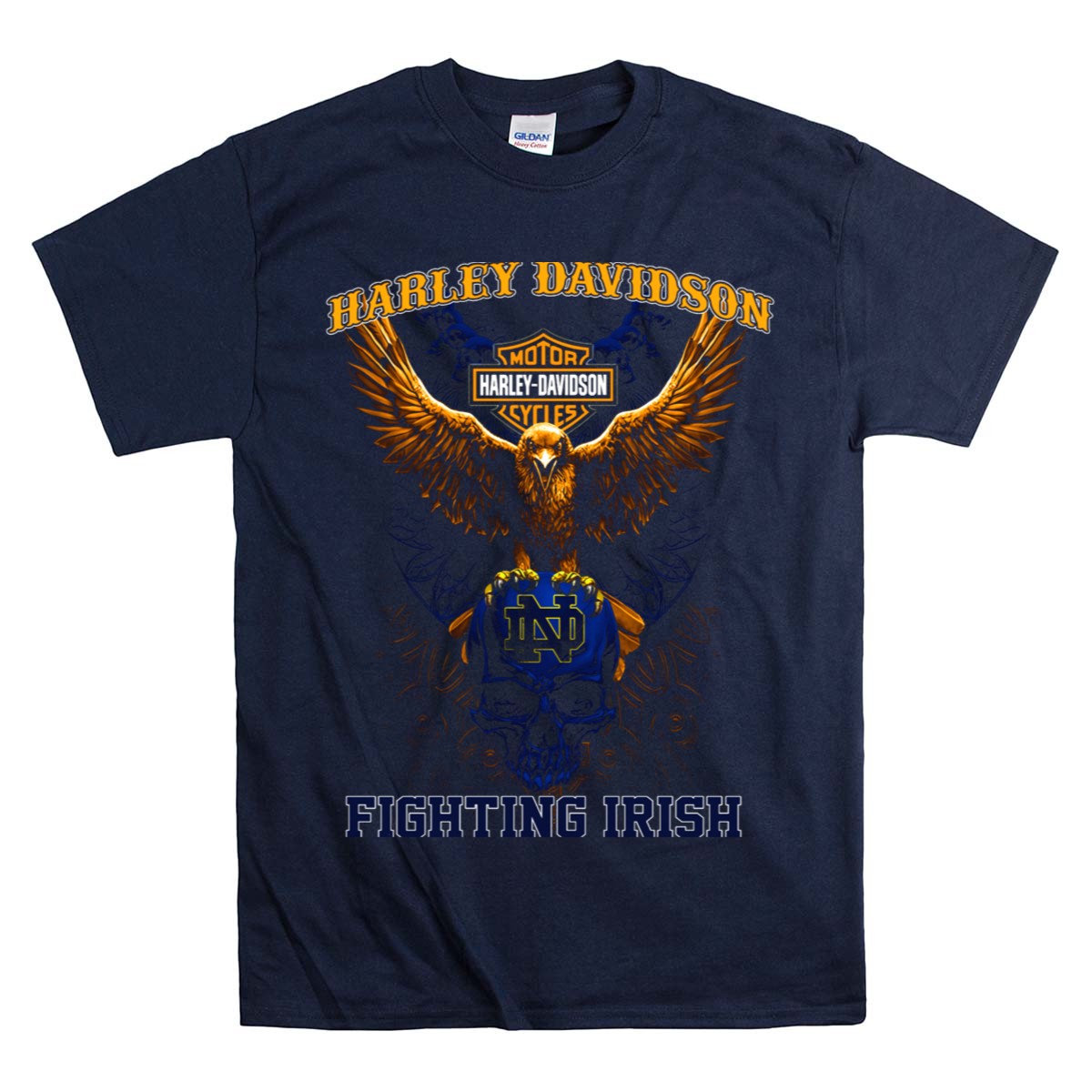 Show off your fierce spirit with the HD Motor Cycles Eagle Notre Dame Fighting Irish Skull T-Shirt. This unisex tee is perfect for fans of the Fighting Irish who want to make a bold statement while keeping it casual. Ideal for themed events, game days, or everyday wear, this shirt seamlessly combines comfort with a striking fan-made design, proudly printed in the USA. Stand out in the crowd and showcase your passion for Notre Dame with this unique piece!