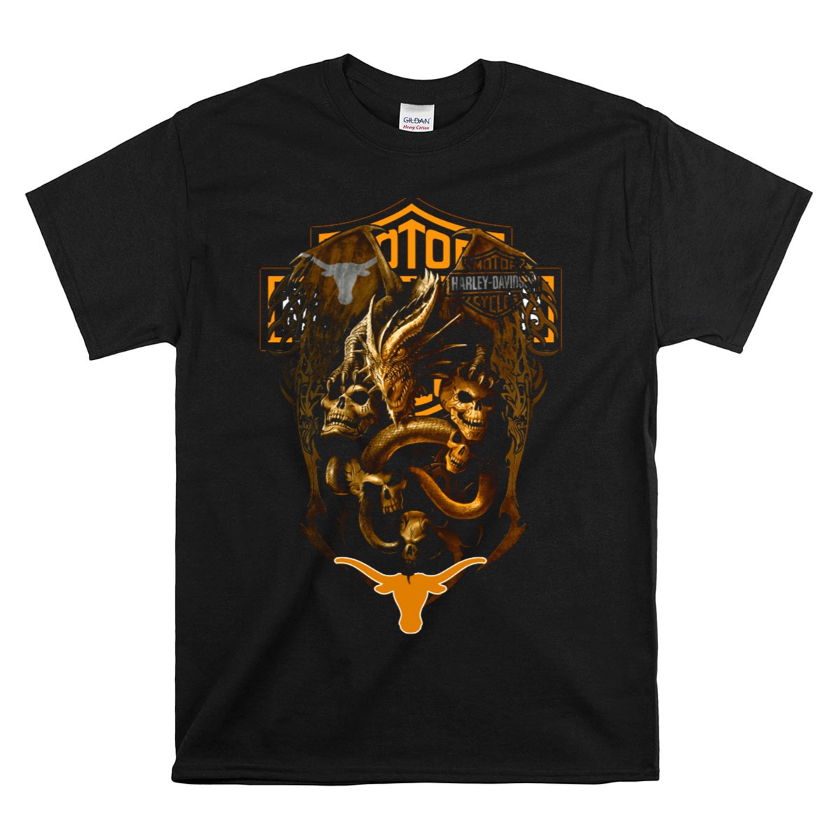 Show off your team spirit with our HD Motorcycles NCAA Texas Longhorns Skull Dragon T-Shirt, designed for true fans who love to stand out. This unique graphic tee combines the fierce energy of motorcycle culture with the pride of the Longhorns, making it perfect for casual wear, themed events, or daily outings. Crafted for comfort and style, this shirt is an essential addition to any fan’s wardrobe, printed with care right here in the USA.