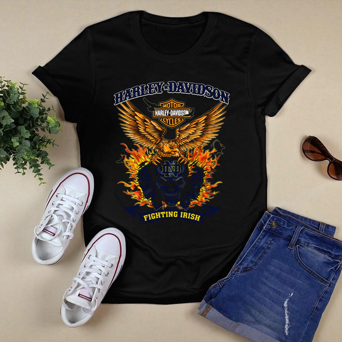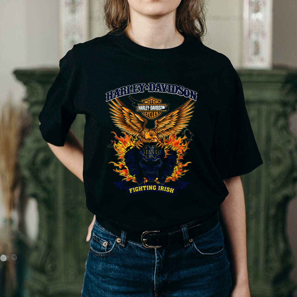 Show your unwavering support for the Notre Dame Fighting Irish with our HD Notre Dame Fighting Irish Skull And Flames T-Shirt. Perfect for fans of all ages, this eye-catching tee is ideal for casual outings, themed events, or just a relaxed day at home. Its unique design combines fierce school spirit with a striking graphic, making it a standout piece in any wardrobe. Crafted with comfort and style in mind, this shirt is a must-have for every Fighting Irish fan!