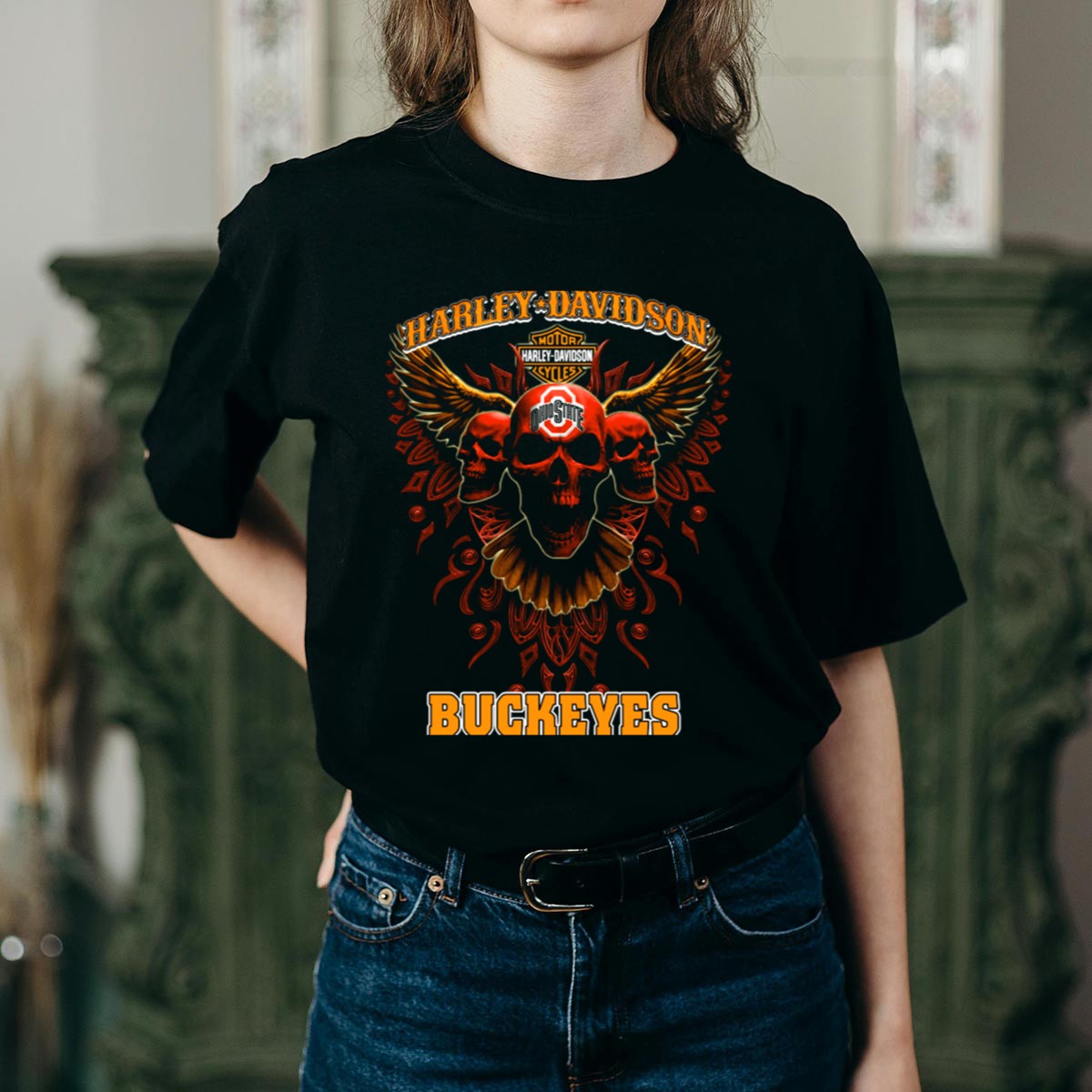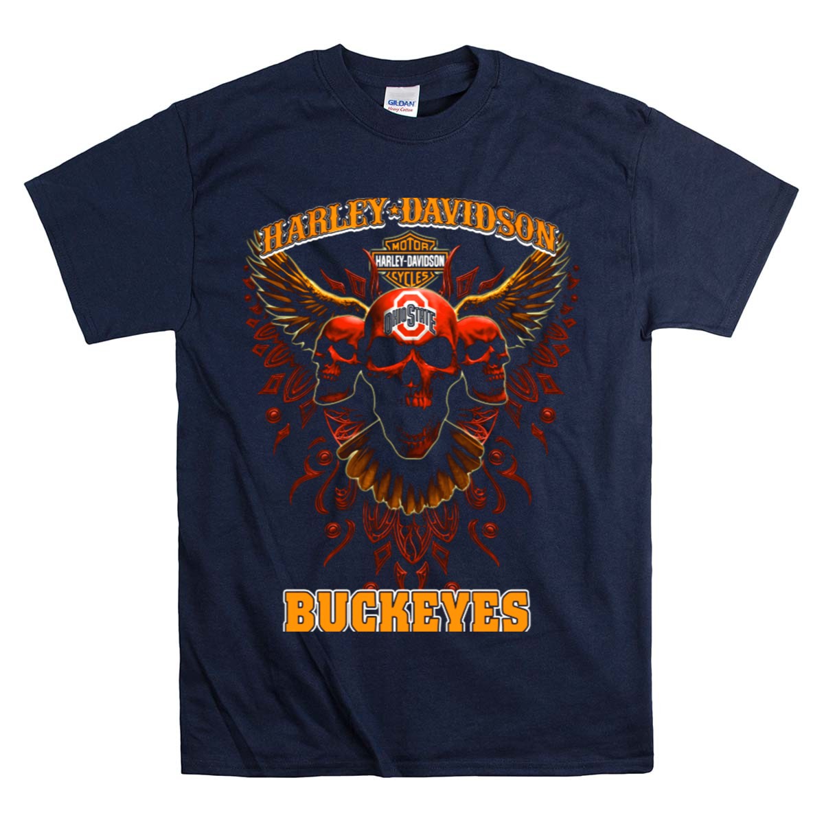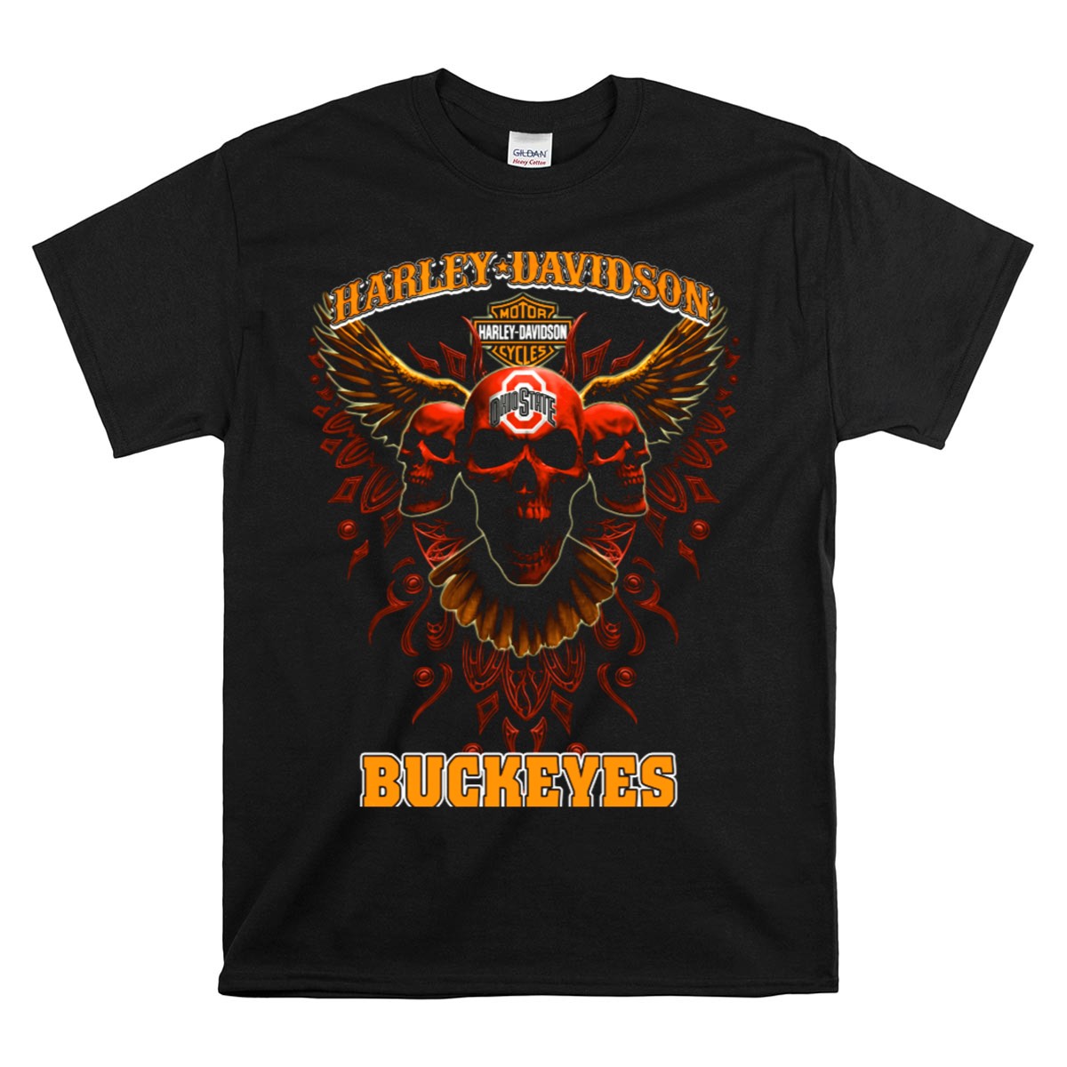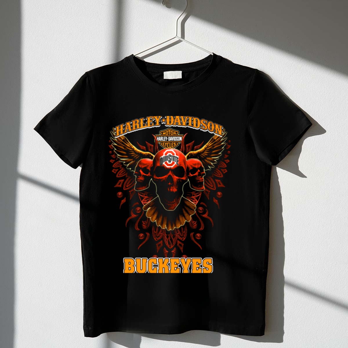 Show your love for both Harley Davidson and the Ohio State Buckeyes with this uniquely designed T-shirt featuring striking motorcycle wings and skulls. Perfect for fans who want to showcase their spirit at casual events, themed gatherings, or during everyday outings, this shirt combines comfort and style effortlessly. Made with a fan-made design and printed in the USA, it’s the ideal choice for those who appreciate quality and bold statements in their wardrobe.