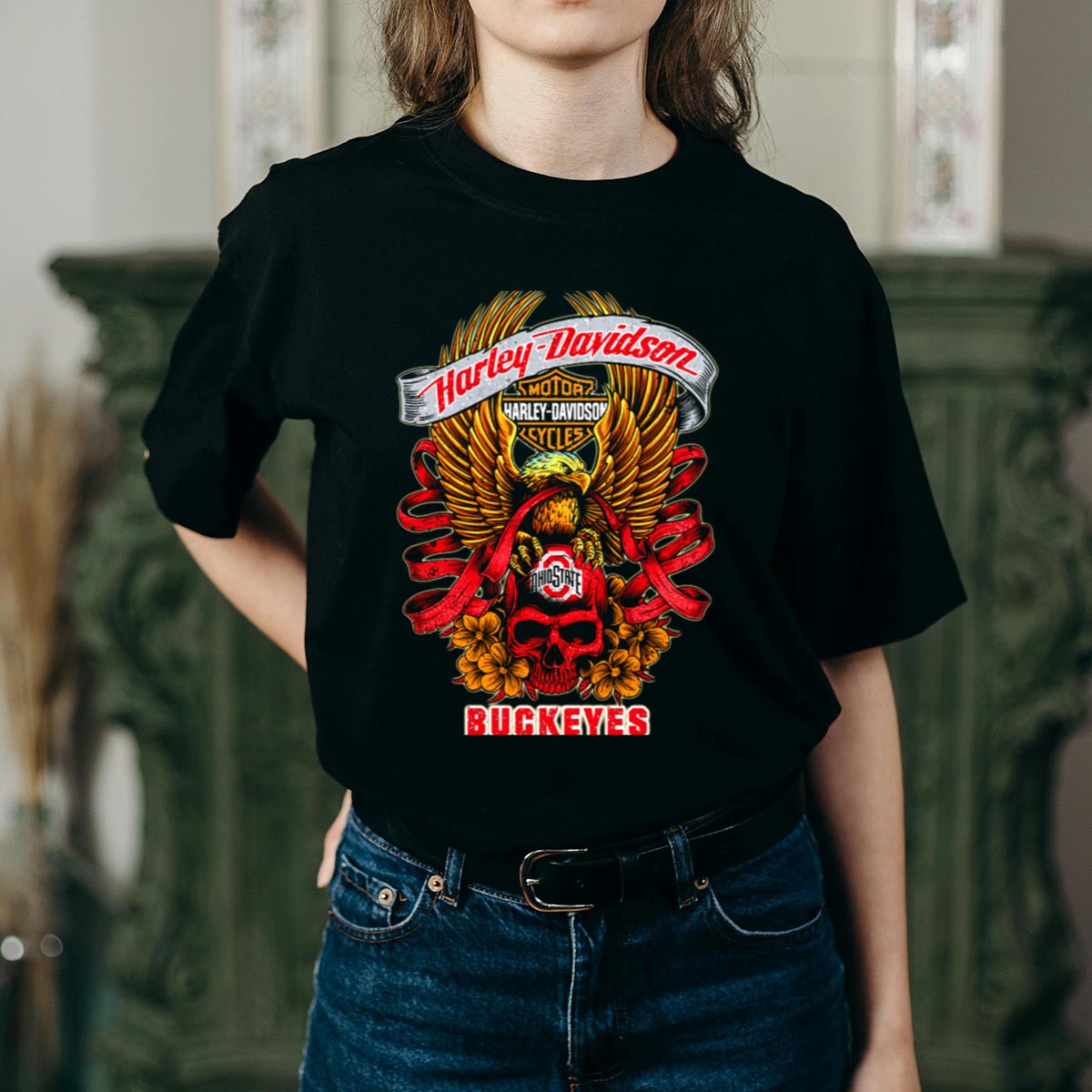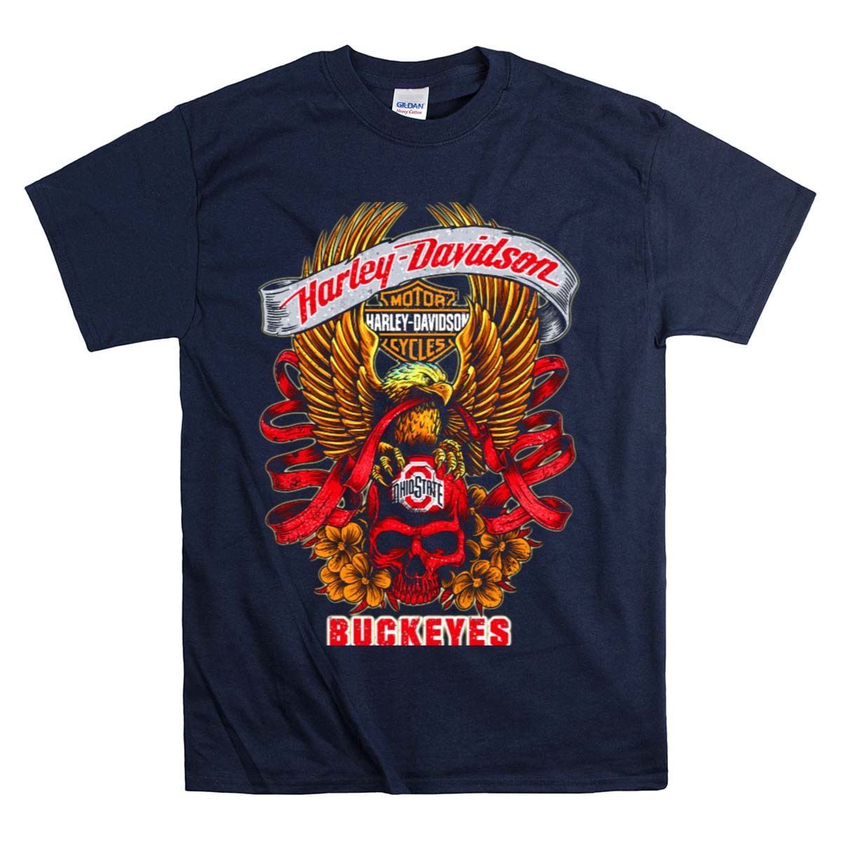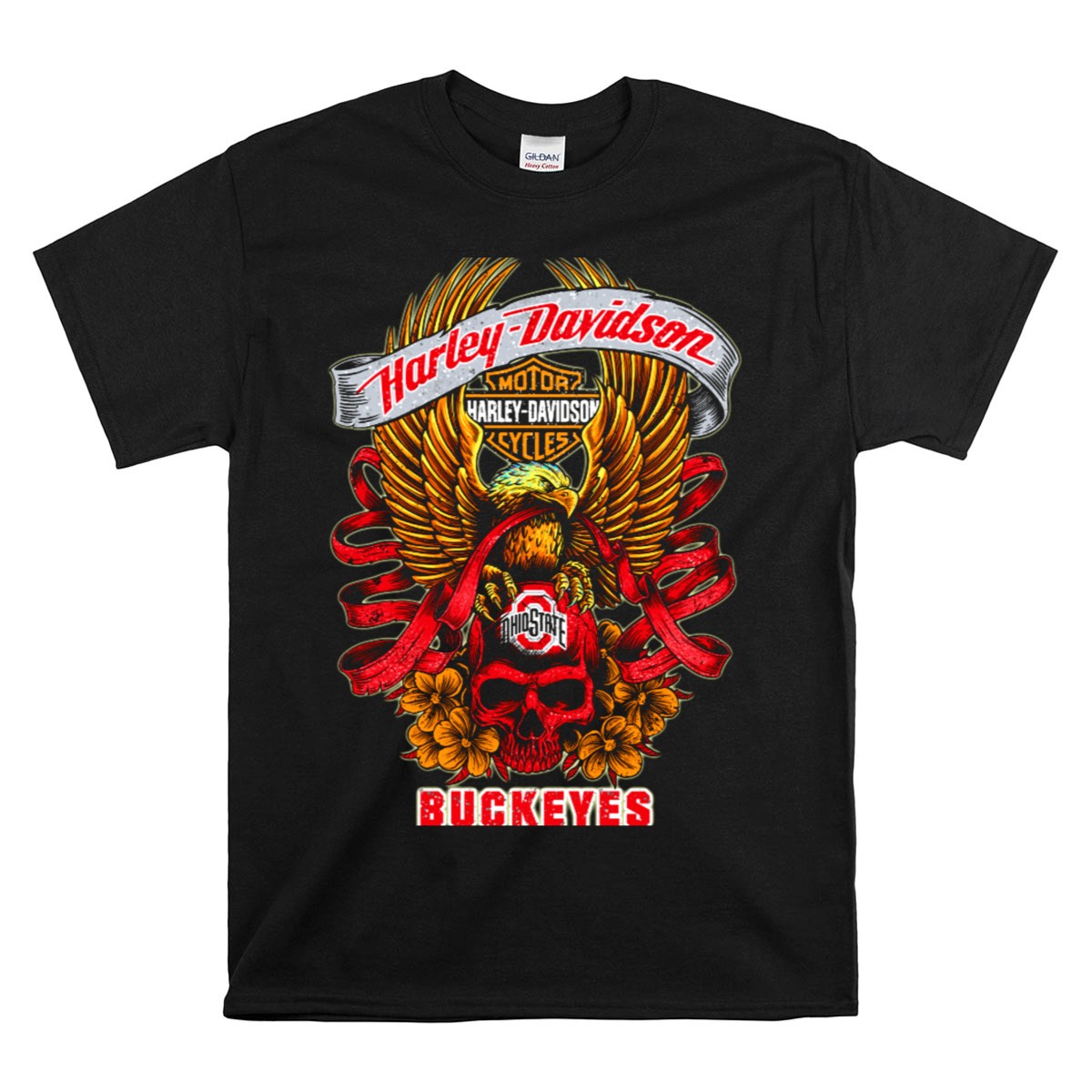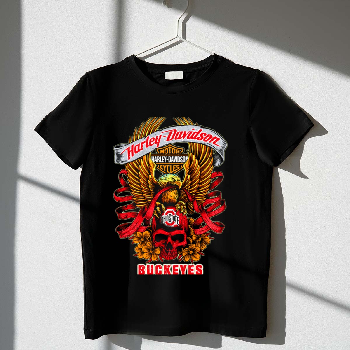 Show your fierce loyalty to the Ohio State Buckeyes with this striking Harley Davidson-inspired T-shirt featuring a bold skull and eagle design. Perfect for die-hard fans, this shirt seamlessly blends casual style with team spirit, making it an ideal choice for game days, themed events, or everyday wear. Crafted for comfort and made to last, it’s a must-have for anyone looking to showcase their Buckeyes pride in a unique way.