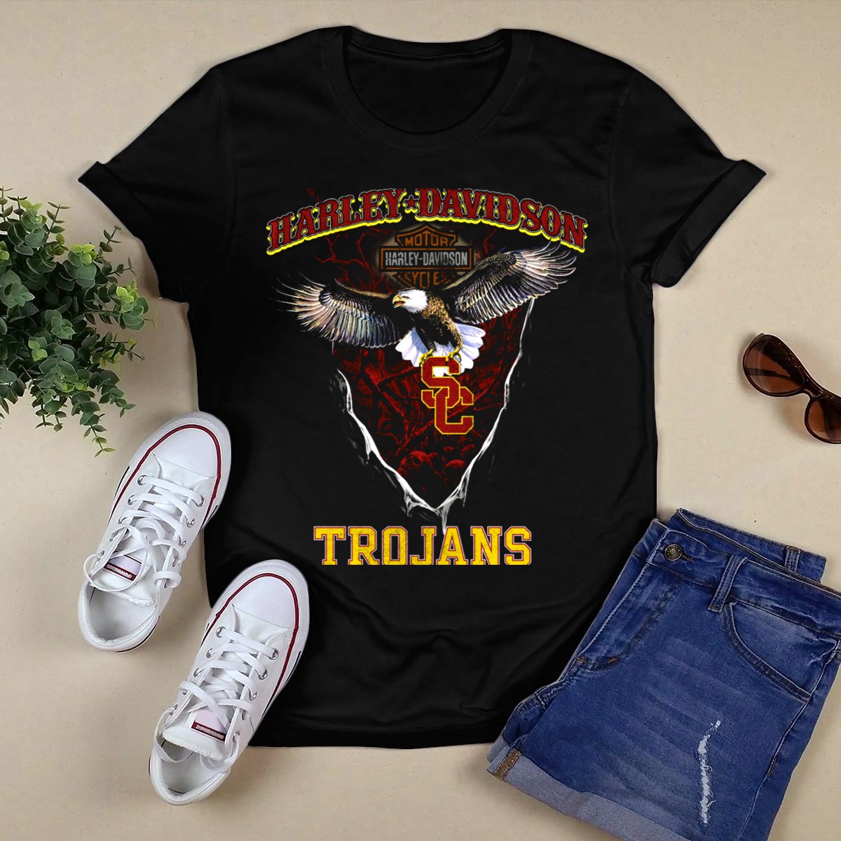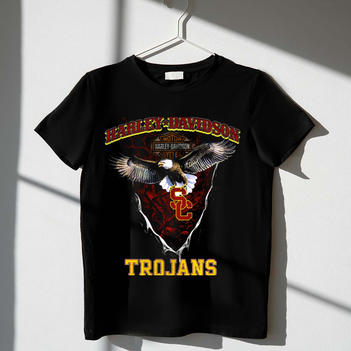 Show your fierce spirit and love for the USC Trojans with our HD Usc Trojans Motor Cycles Eagle T-Shirt! Perfect for fans of all ages, this shirt embodies the strength and determination of the Trojans. Whether you’re cheering from the stands at a game, enjoying a themed event, or just hanging out with friends, this shirt’s unique design makes it a standout choice for any casual occasion. Proudly printed in the USA, it combines comfort and style in one eye-catching package.