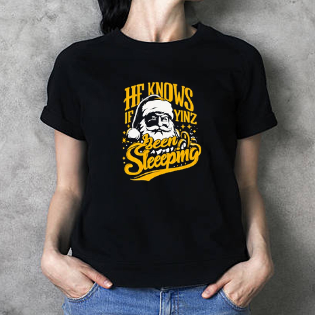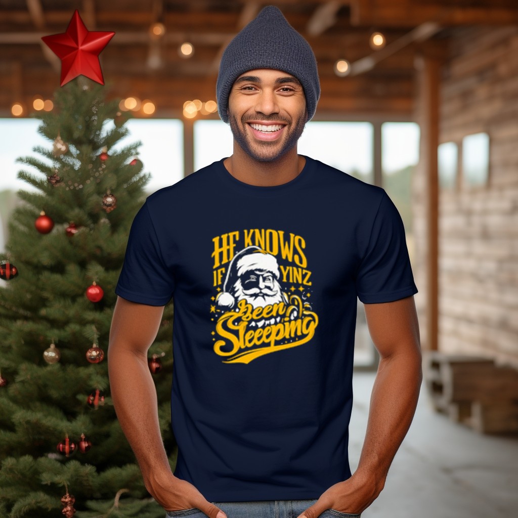 Embrace the holiday spirit with our He Knows If Yinz Been Sleeeping Yinzer Santa Pittsburgh Christmas T-Shirt! This fun and festive tee is perfect for proud Pittsburghers and fans of the Yinzer culture. Whether you’re attending a holiday party, enjoying a casual day out, or just lounging at home, this shirt brings a unique and playful twist to your Christmas wardrobe. Crafted with a fan-made design and printed in the USA, it’s not just a t-shirt; it’s a celebration of community and cheer.