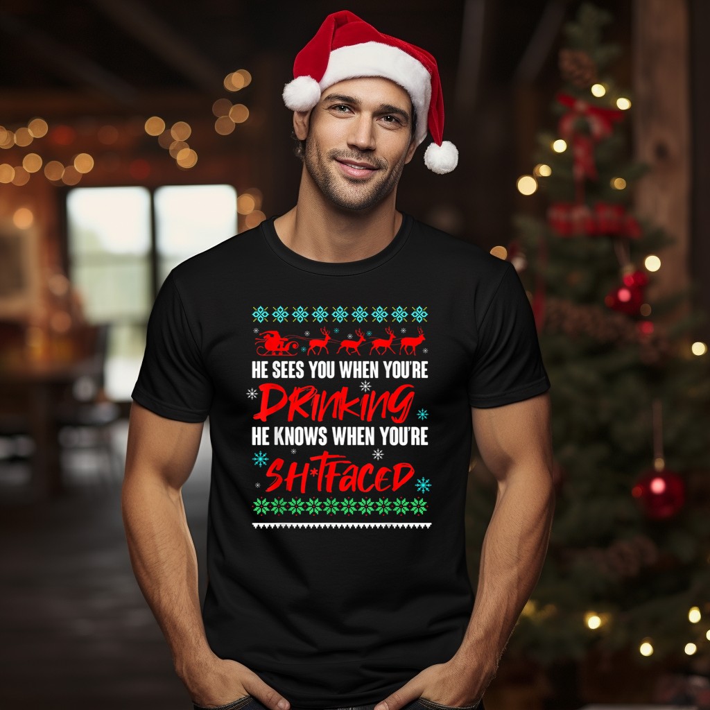 Celebrate the festive spirit with our “He Sees You When You’re Drinking He Knows When You’re Sh Tfaced” Santa Reindeer T-shirt! This fun and quirky design is perfect for those who love to spread holiday cheer while enjoying a drink or two. Ideal for casual gatherings, themed events, or simply adding a touch of humor to your daily wear, this shirt is a must-have for anyone looking to make a statement during the holiday season. Plus, it’s proudly printed in the USA, making it a unique addition to your wardrobe.