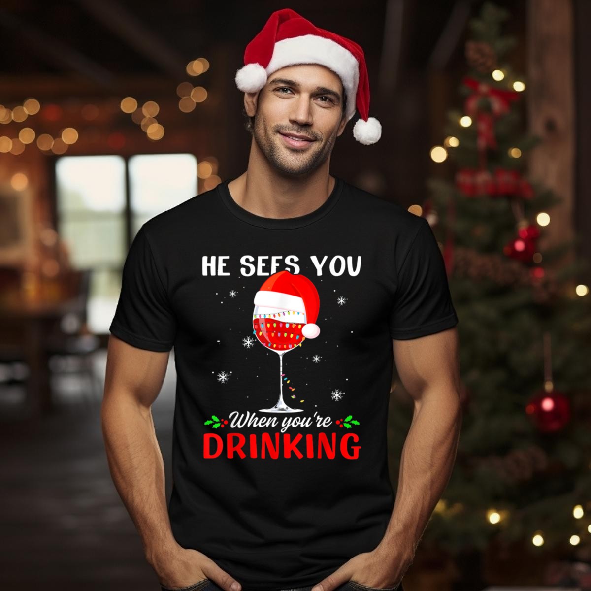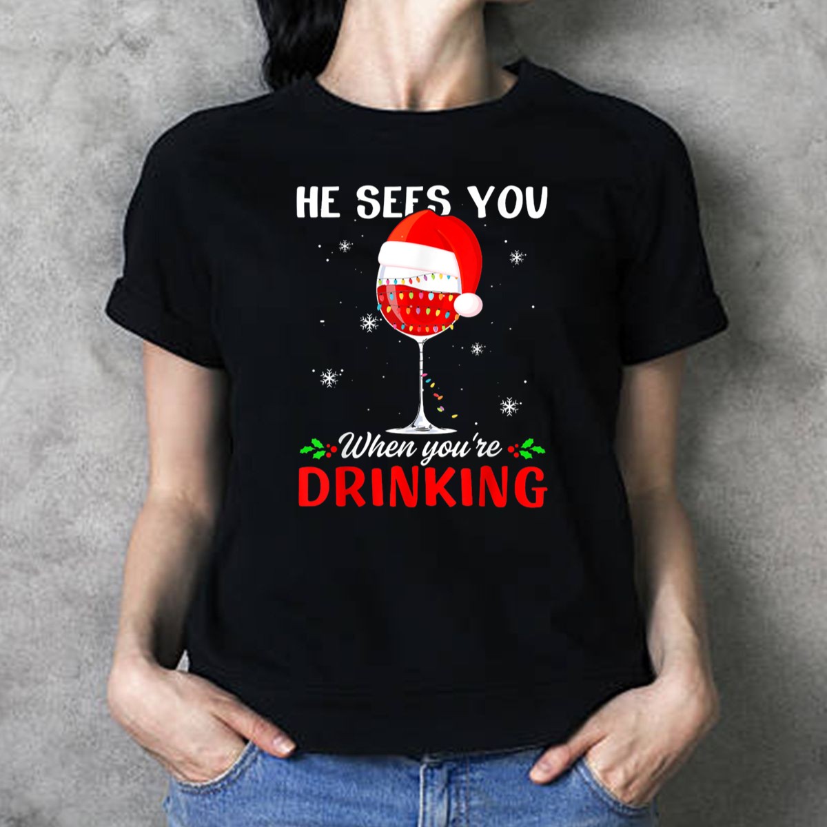 He Sees You When Youre Drinking Santa Hat Wine Glass Christmas Lights T Shirt
