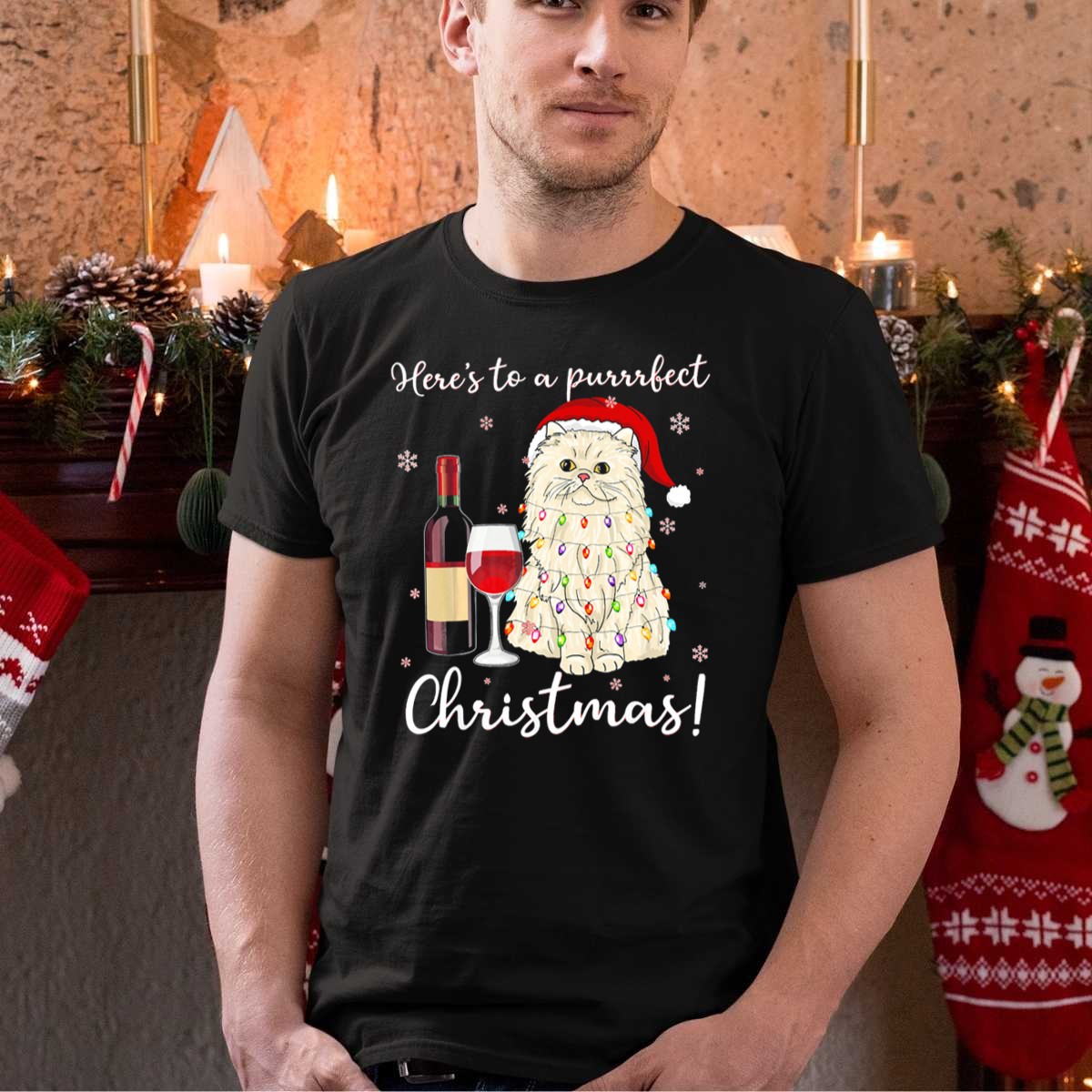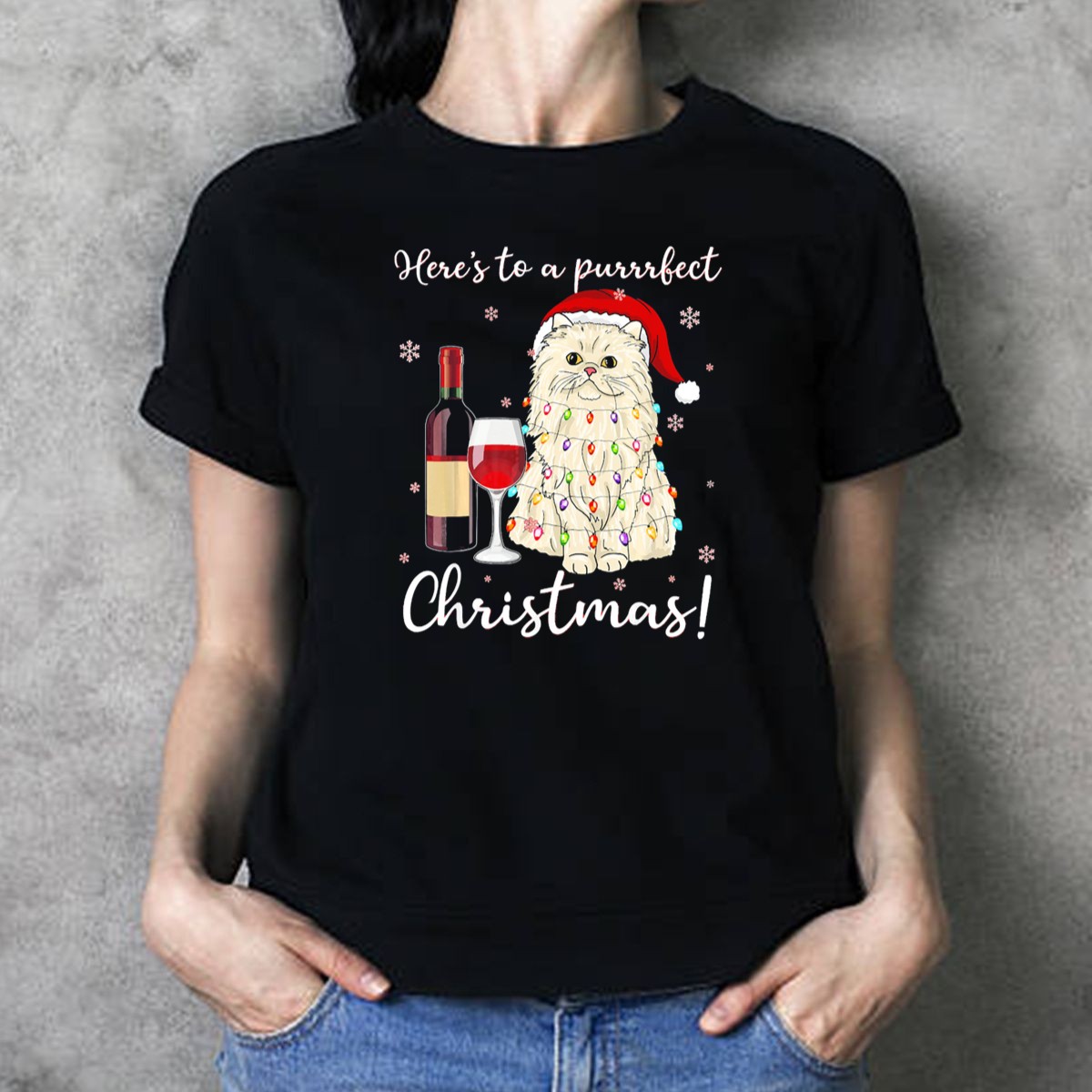 Be the first to review “Heres To A Purrrfect Christmas With Wine And Persian Cat In Santa Hat T Shirt”