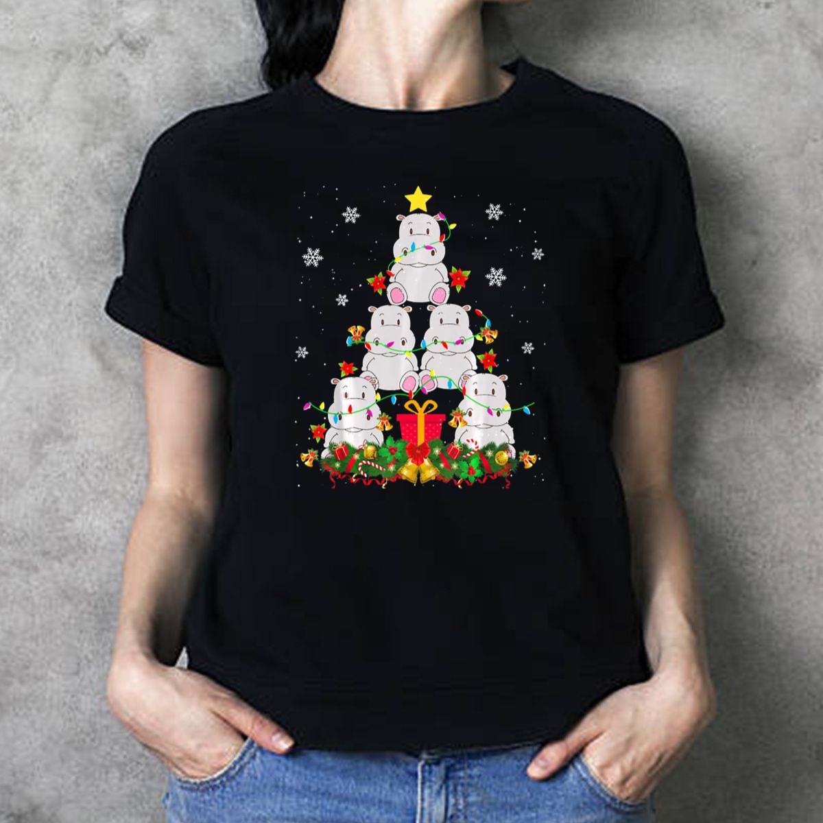 Celebrate the holiday season in style with our Hippo Christmas Tree T-shirt, featuring an adorable hippopotamus surrounded by festive lights and gifts. Perfect for animal lovers and anyone looking to add a touch of whimsy to their holiday wardrobe, this shirt is ideal for casual outings, themed events, or just spreading some cheer during daily wear. Made with care in the USA, this unique fan-made design is sure to become a favorite for all your seasonal festivities.