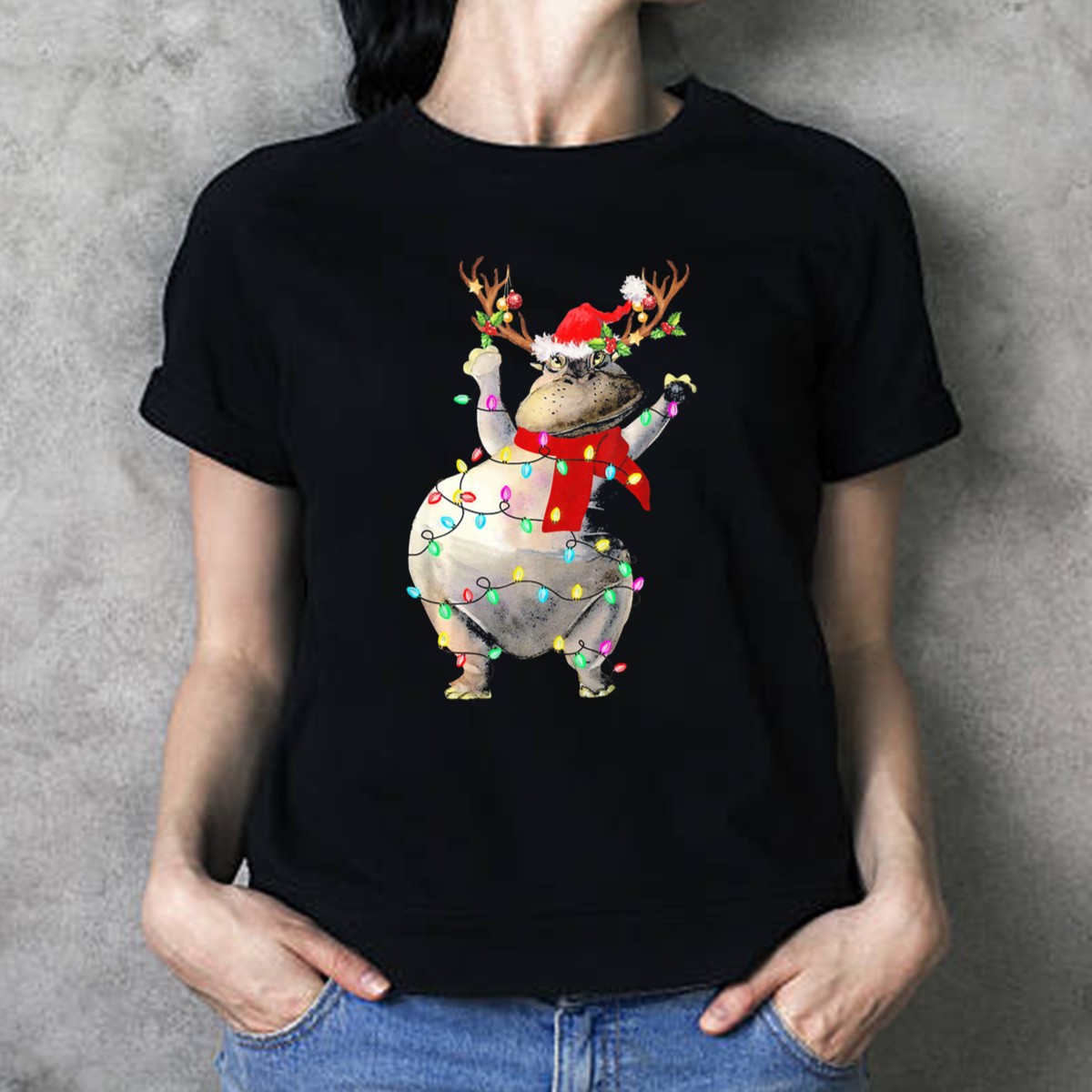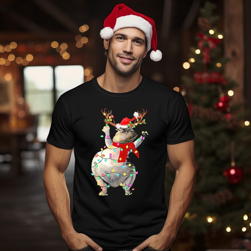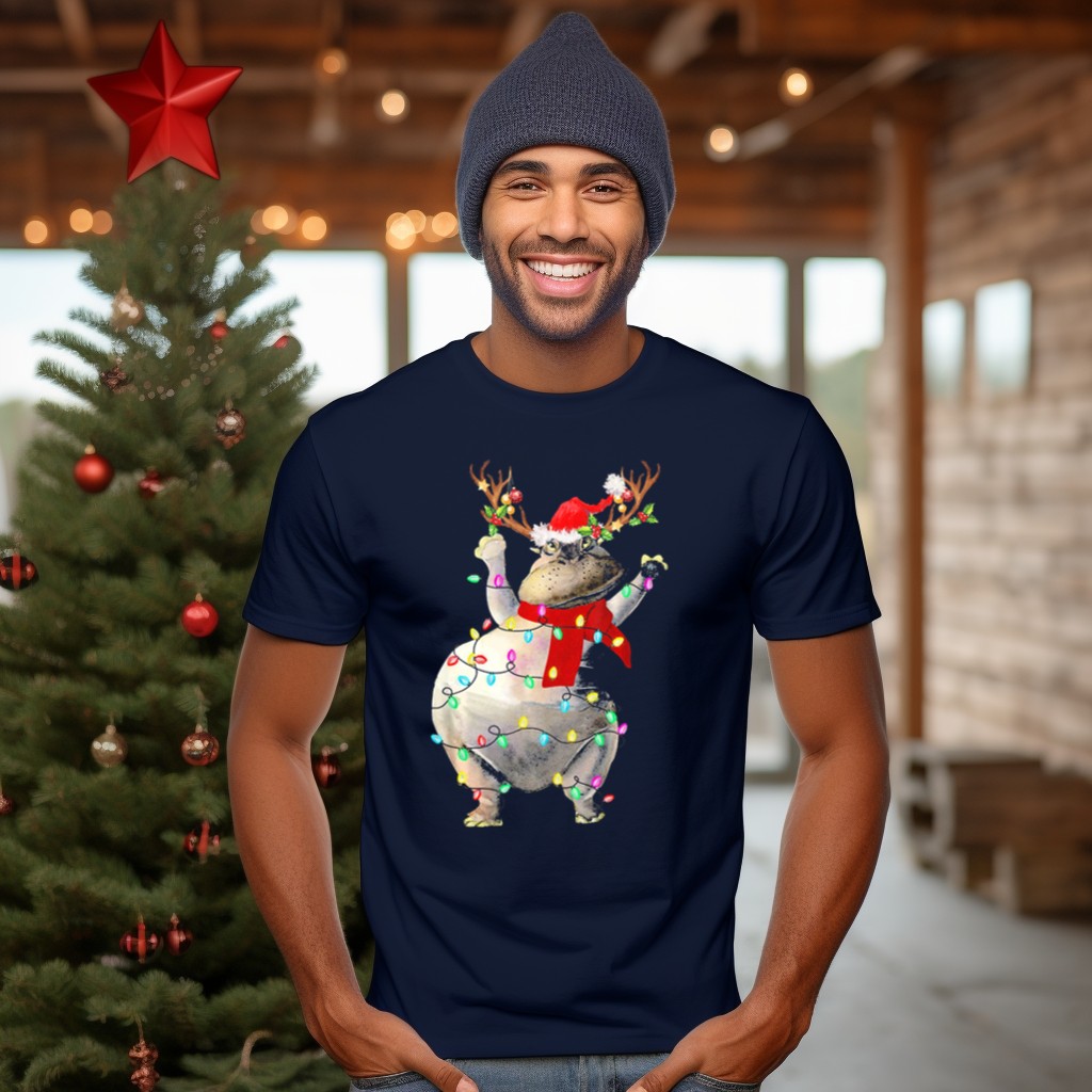 Be the first to review “Hippopotamus In Santa Hat With Reindeer Antlers And Christmas Lights T-Shirt”
