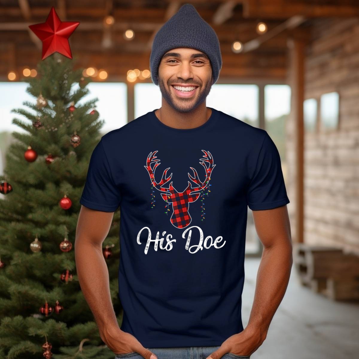 Celebrate the holiday season in style with our His Doe Couples Matching Christmas T-Shirt! Perfect for couples looking to showcase their festive spirit, this shirt features a charming design of buffalo plaid reindeer antlers adorned with string lights. Ideal for cozy gatherings, themed events, or simply lounging around during the holidays, this fan-made graphic tee is a unique addition to your seasonal wardrobe, proudly printed in the USA for a touch of hometown pride.