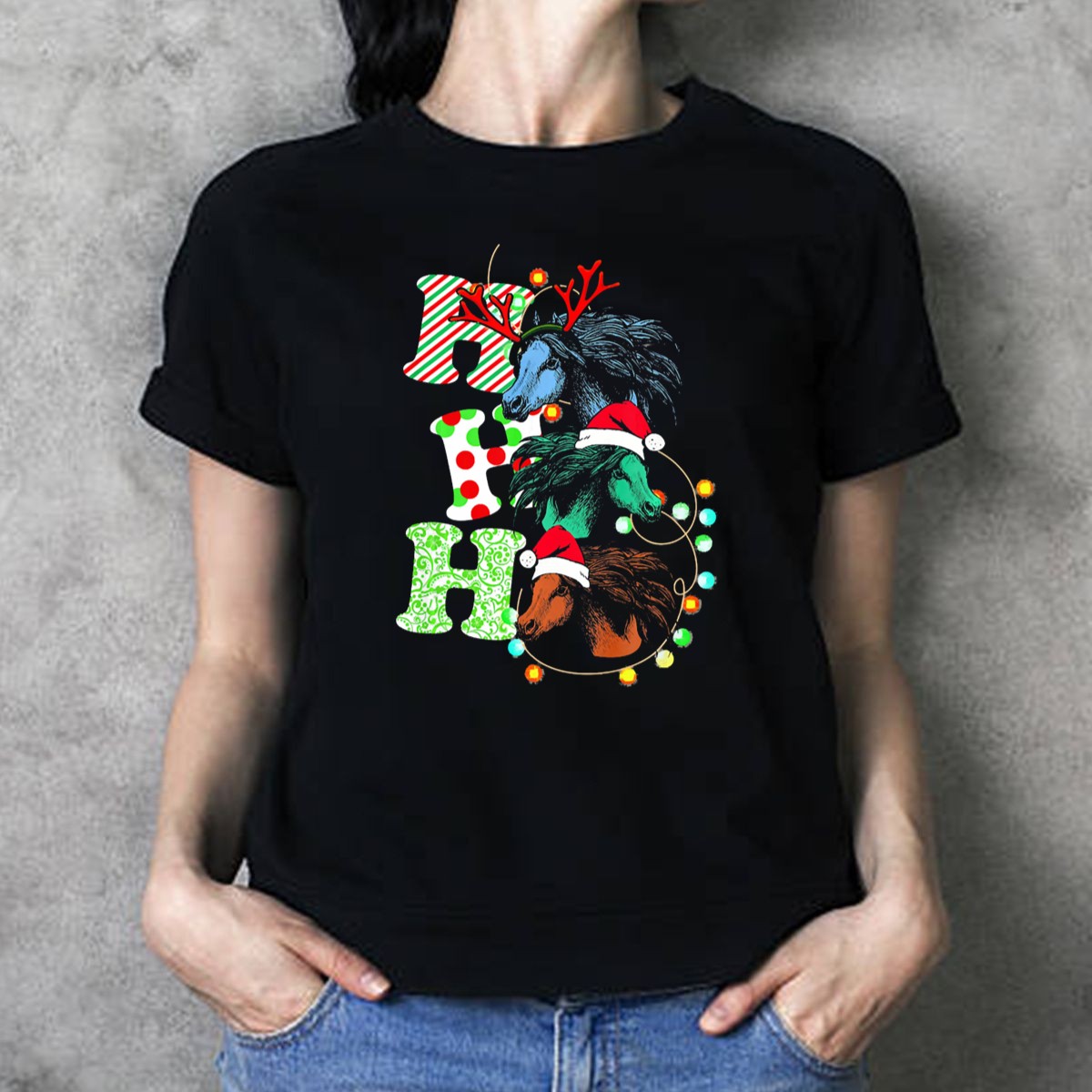 Be the first to review “Ho Ho Ho Christmas Horse With Antlers And Santa Hats T Shirt”