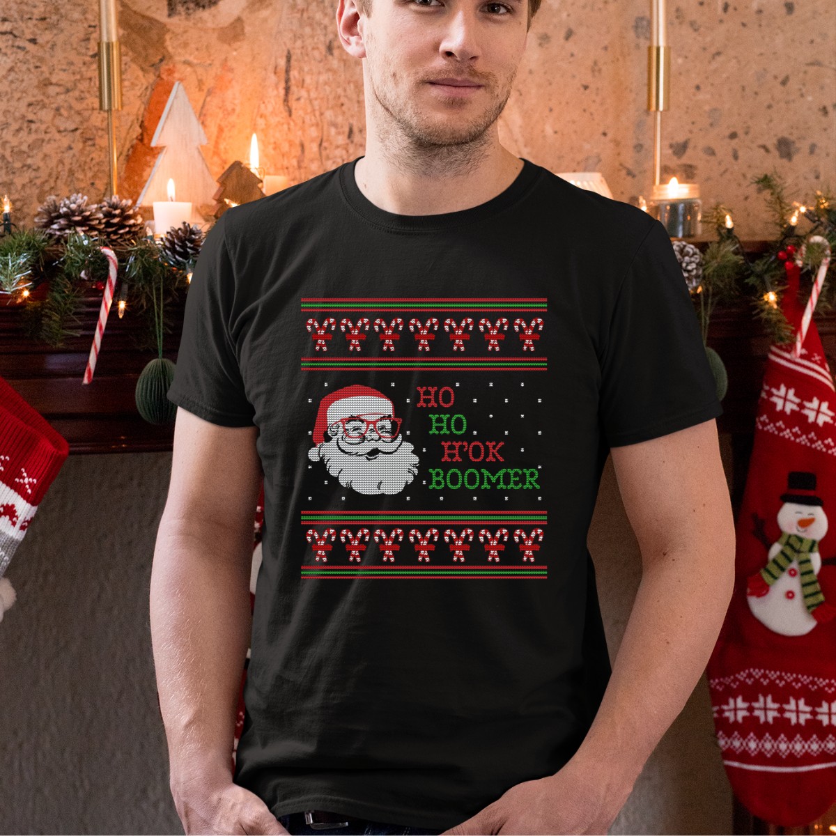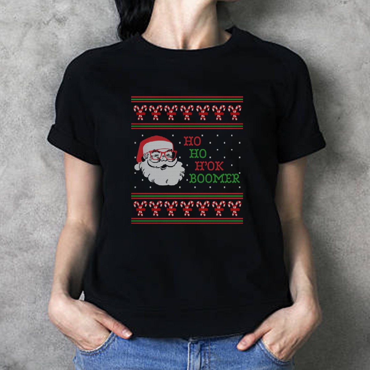 Be the first to review “Ho Ho Ho Ok Boomer Ugly Christmas Sweater Style Santa Candy Canes T-Shirt”