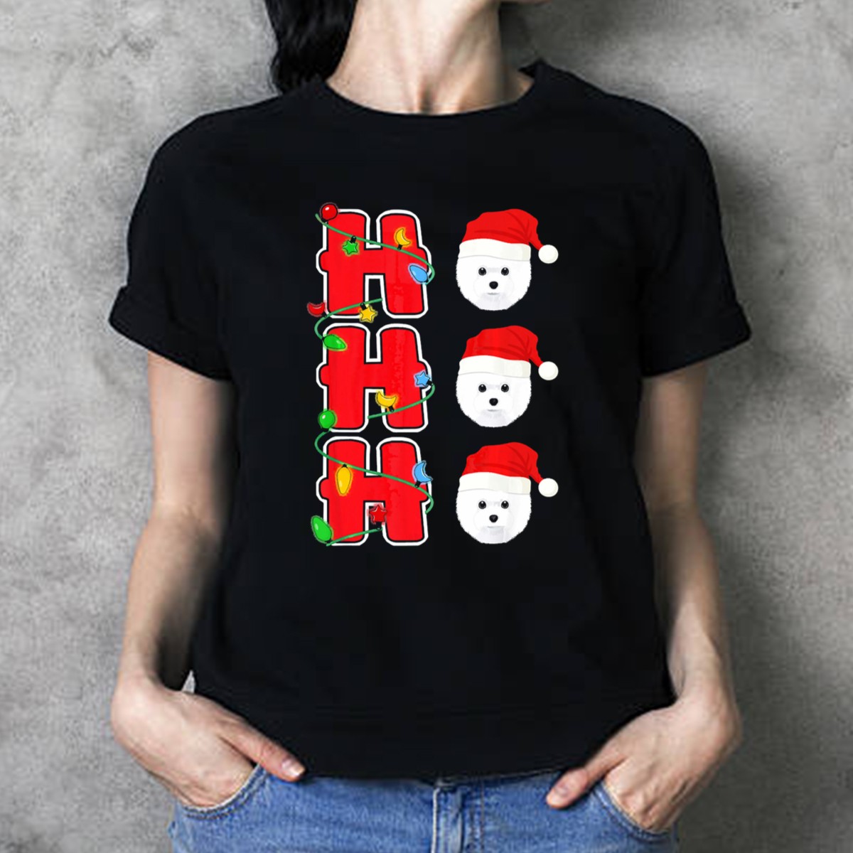 Ho Ho Ho Santa Hat Bichon Frise Christmas Lights T-Shirt