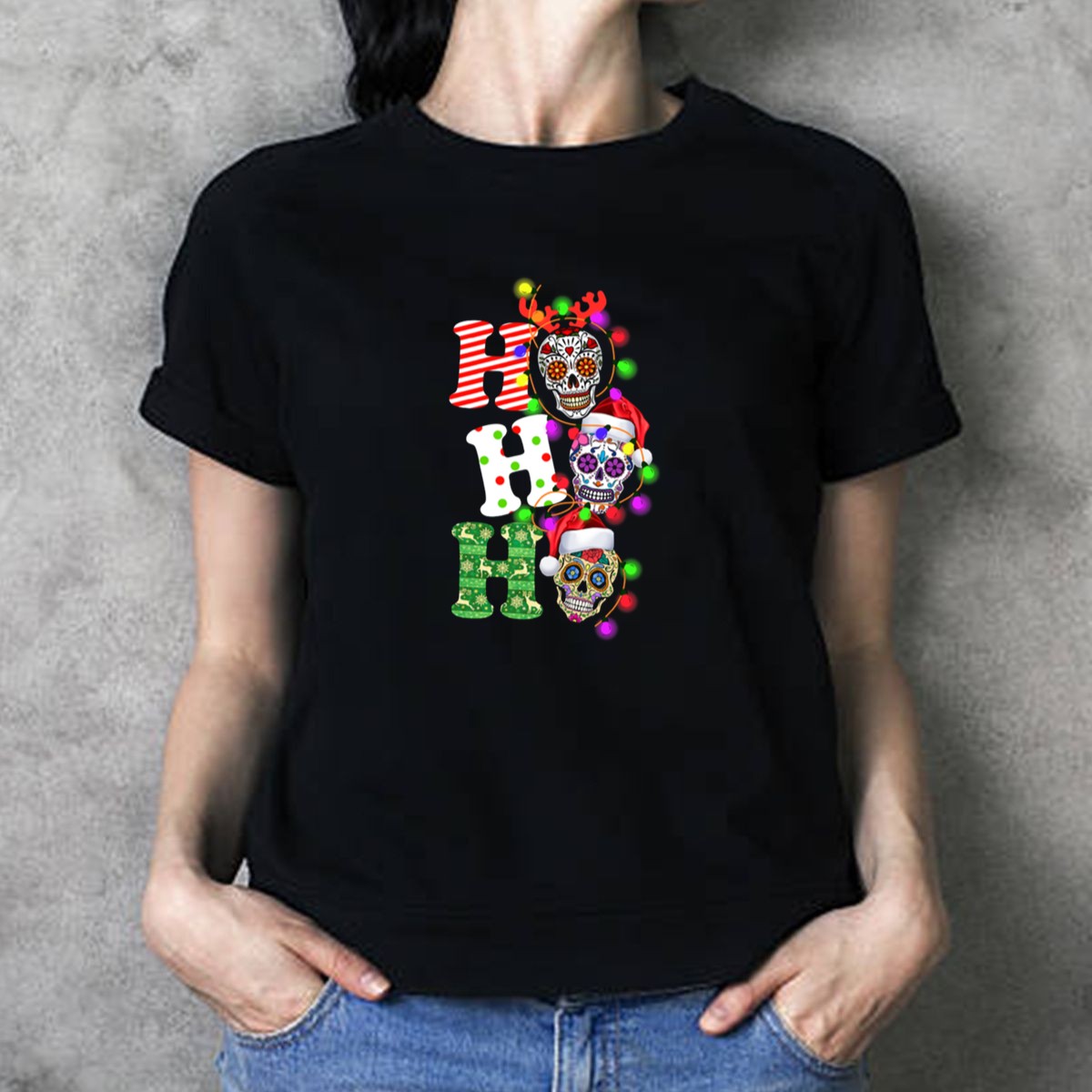 Celebrate the holiday season in style with our Ho Ho Ho Sugar Skull Christmas Lights Santa Hats Reindeer Antlers T-Shirt! Perfect for festive gatherings, themed events, or simply spreading cheer on a casual day out, this unique design combines traditional Christmas elements with a vibrant twist. Made for those who love to express their individuality, this shirt is a must-have for anyone looking to add a fun flair to their holiday wardrobe.