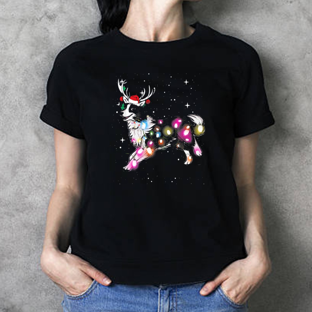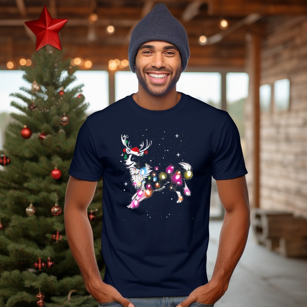Celebrate the festive season in style with our Holiday Reindeer Border Collie T-Shirt! This delightful fan-made design features an adorable Border Collie adorned with Christmas lights and a cheerful Santa hat, surrounded by whimsical snowflakes. Perfect for dog lovers and holiday enthusiasts alike, this shirt is ideal for casual outings, themed events, or simply spreading holiday cheer during your daily wear. Printed in the USA, this unique tee is sure to bring a smile to everyone you meet!