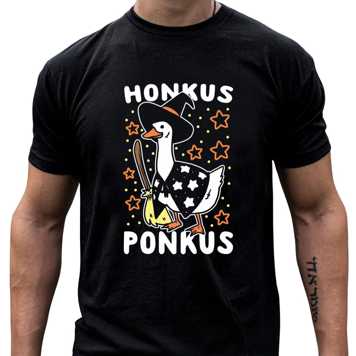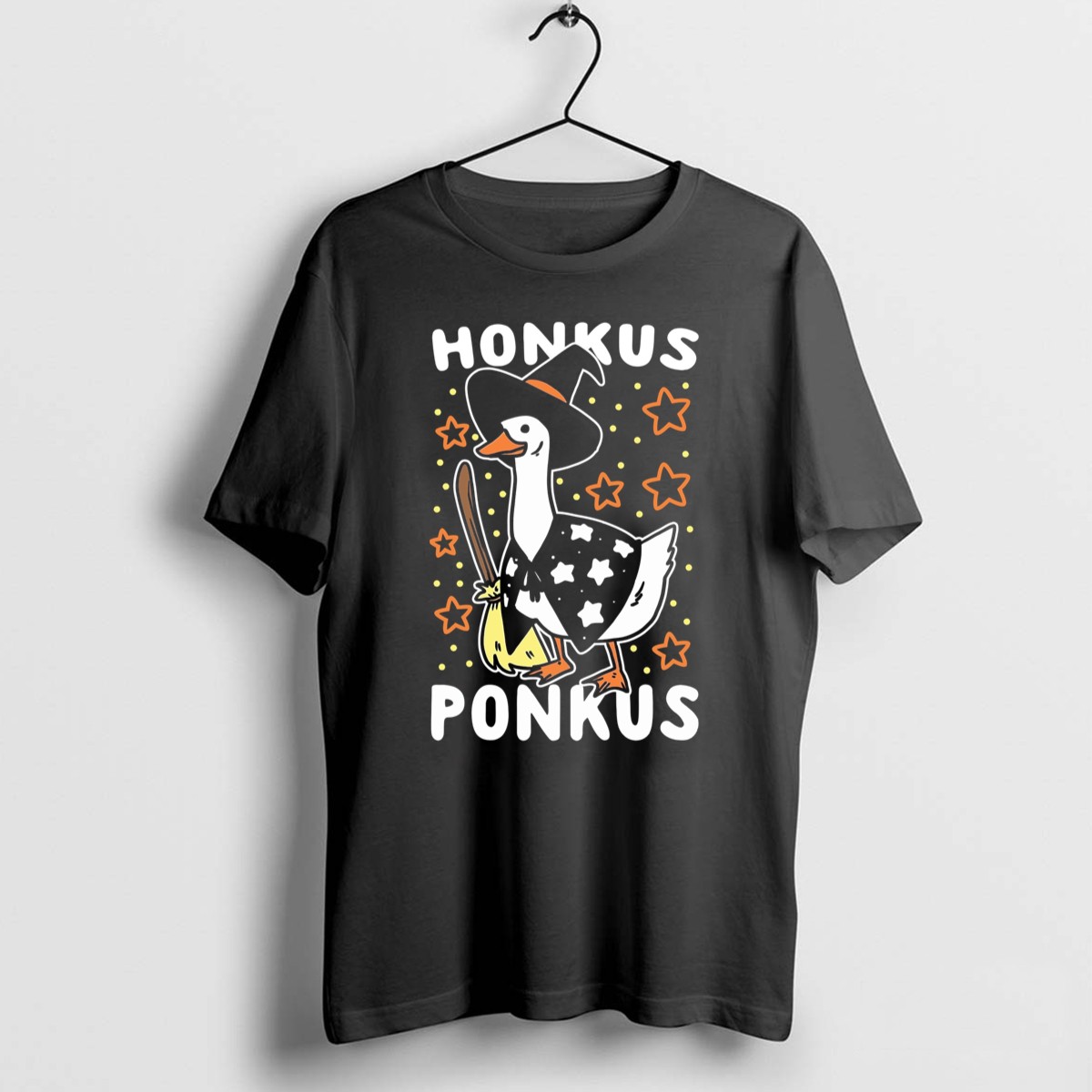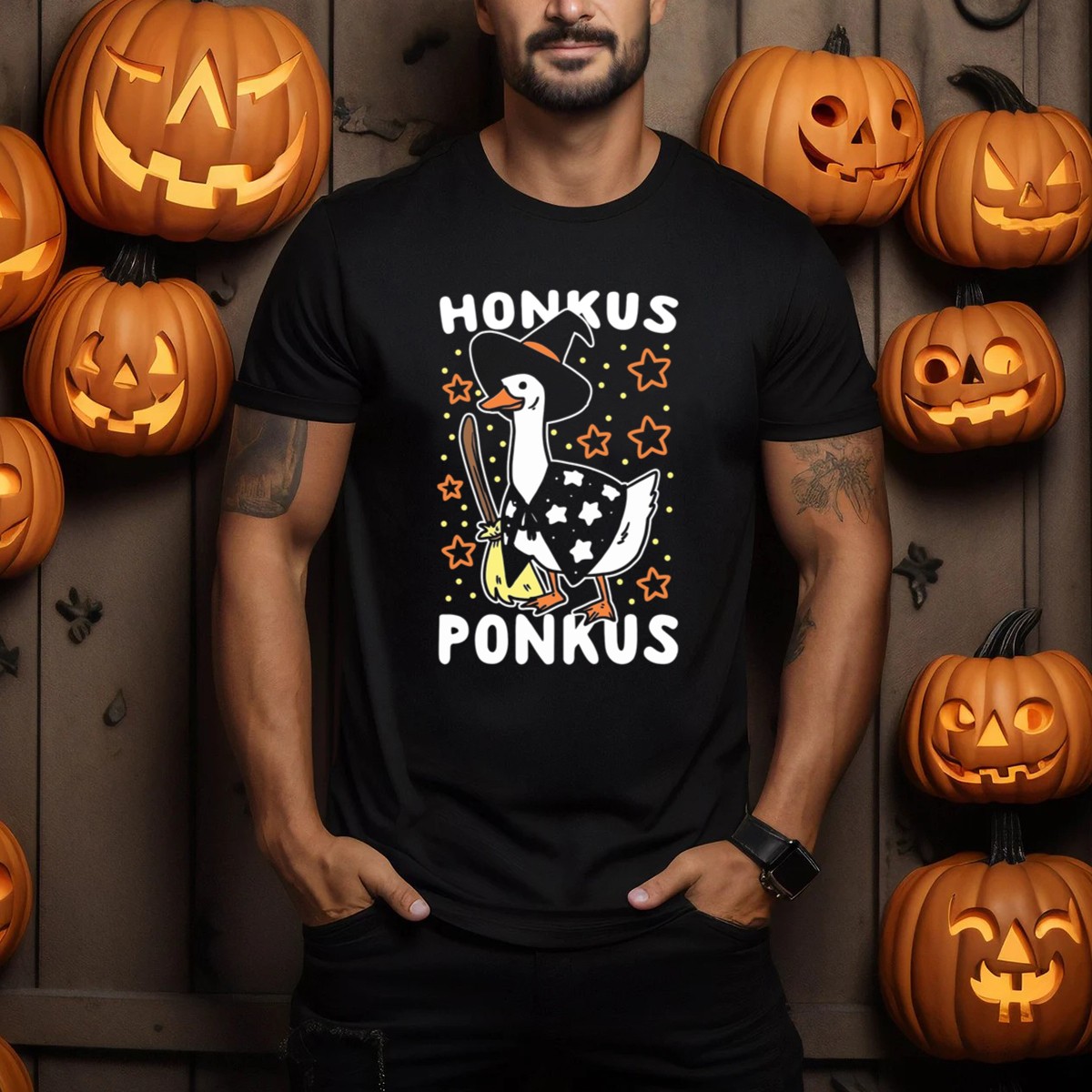 Embrace the spooky spirit of Halloween with our Honkus Ponkus Goose Meme Witch Hat Costume T-Shirt! Perfect for meme lovers and Halloween enthusiasts alike, this fun and whimsical design showcases a playful goose wearing a witch hat adorned with stars and a broom. Ideal for casual wear, themed events, or just a fun day out, this shirt is sure to be a conversation starter and spread smiles wherever you go. Made with high-quality materials and printed right here in the USA, it combines comfort with a unique flair that sets you apart from the crowd.