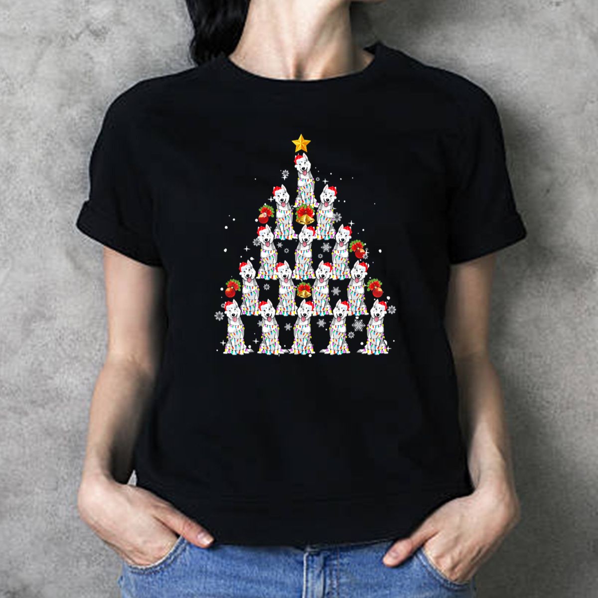 Celebrate the holiday spirit with our festive Husky Dogs With Santa Hats And Christmas Lights T-Shirt! Perfect for dog lovers and holiday enthusiasts, this cheerful design features adorable huskies adorned with Santa hats and twinkling lights, creating a whimsical Christmas tree effect. Ideal for casual wear, themed events, or simply spreading joy during the holiday season, this shirt is a must-have for your wardrobe. Made with a fan-made design printed in the USA, it combines comfort and style for a truly unique festive look.