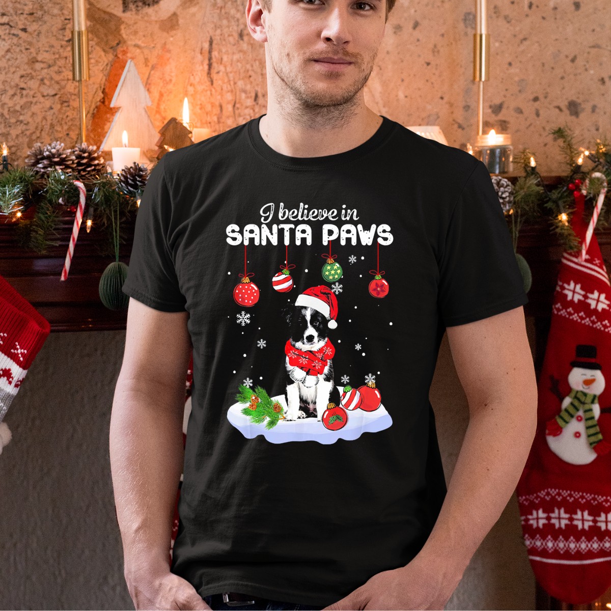 Celebrate the festive spirit with our “I Believe In Santa Paws” Border Collie Christmas Ornaments Snowflakes T-Shirt! Perfect for dog lovers and holiday enthusiasts alike, this charming shirt showcases your love for your furry friend while spreading joy during the holiday season. Ideal for casual outings, themed events, or simply lounging at home, this unique fan-made design is printed in the USA, making it a delightful addition to your seasonal wardrobe.