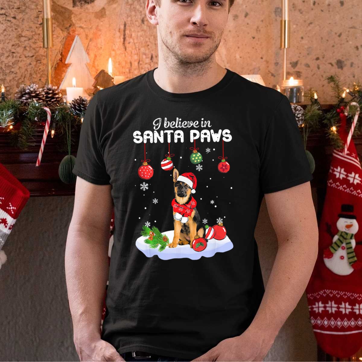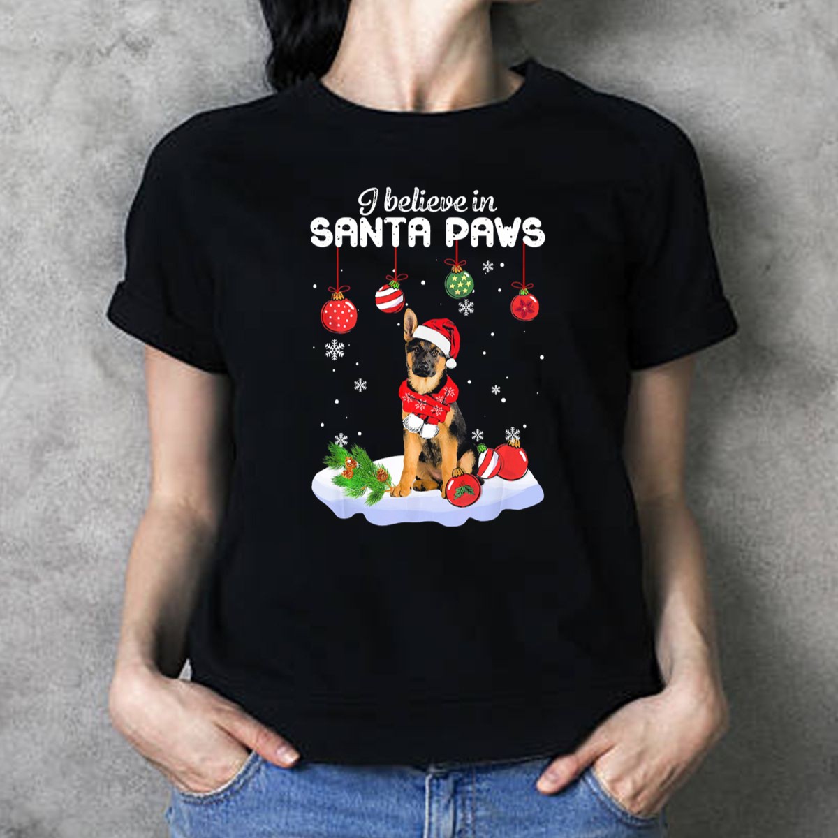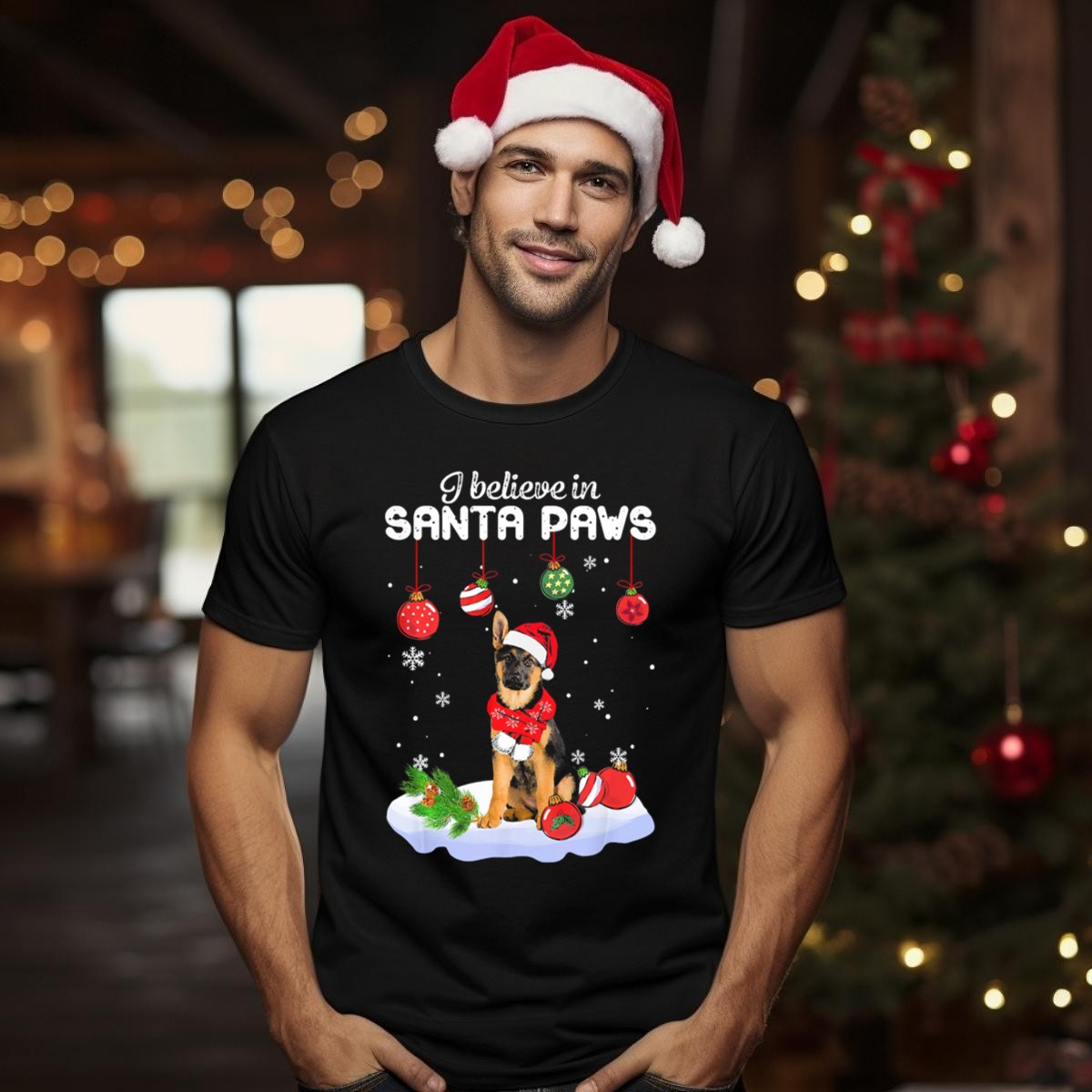 Celebrate the festive spirit with our “I Believe In Santa Paws” T-shirt, featuring a playful graphic of a German Shepherd adorned with a Santa hat and Christmas ornaments. Perfect for dog lovers and holiday enthusiasts alike, this shirt is an ideal choice for casual wear, themed events, or simply spreading joy during the holiday season. Made with care and printed in the USA, this fan-made design is sure to bring a smile to everyone you meet!