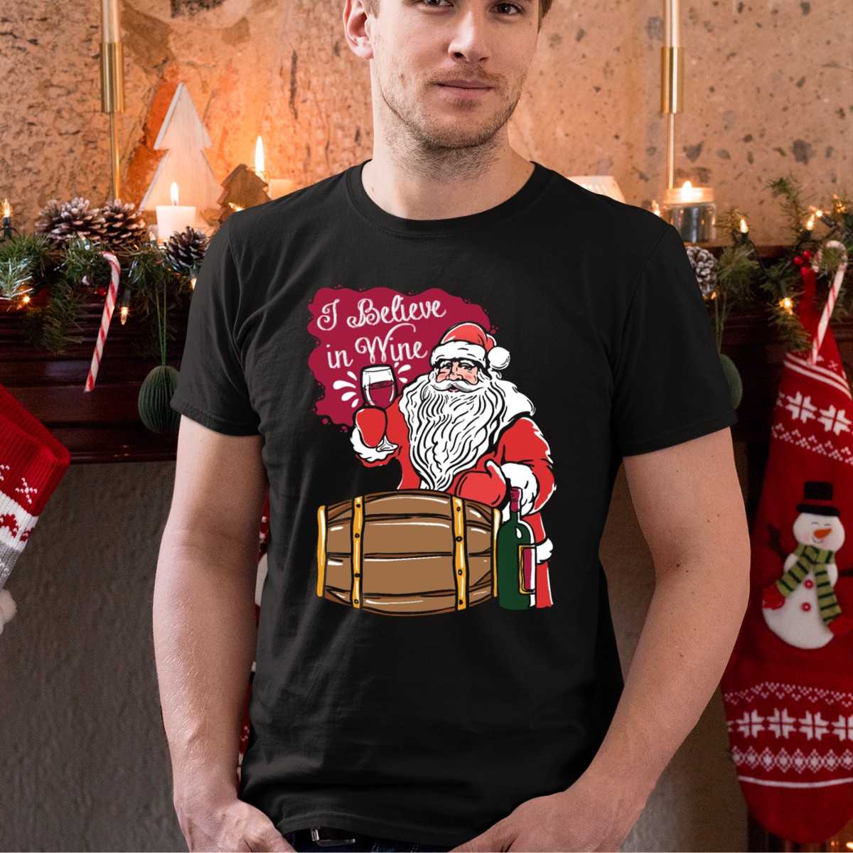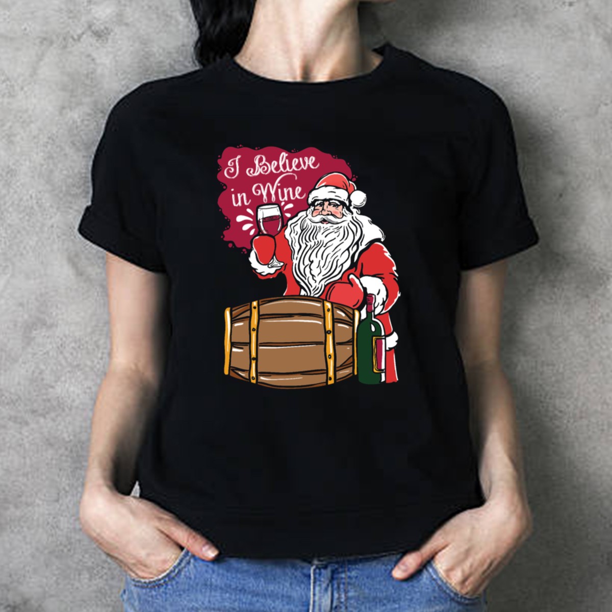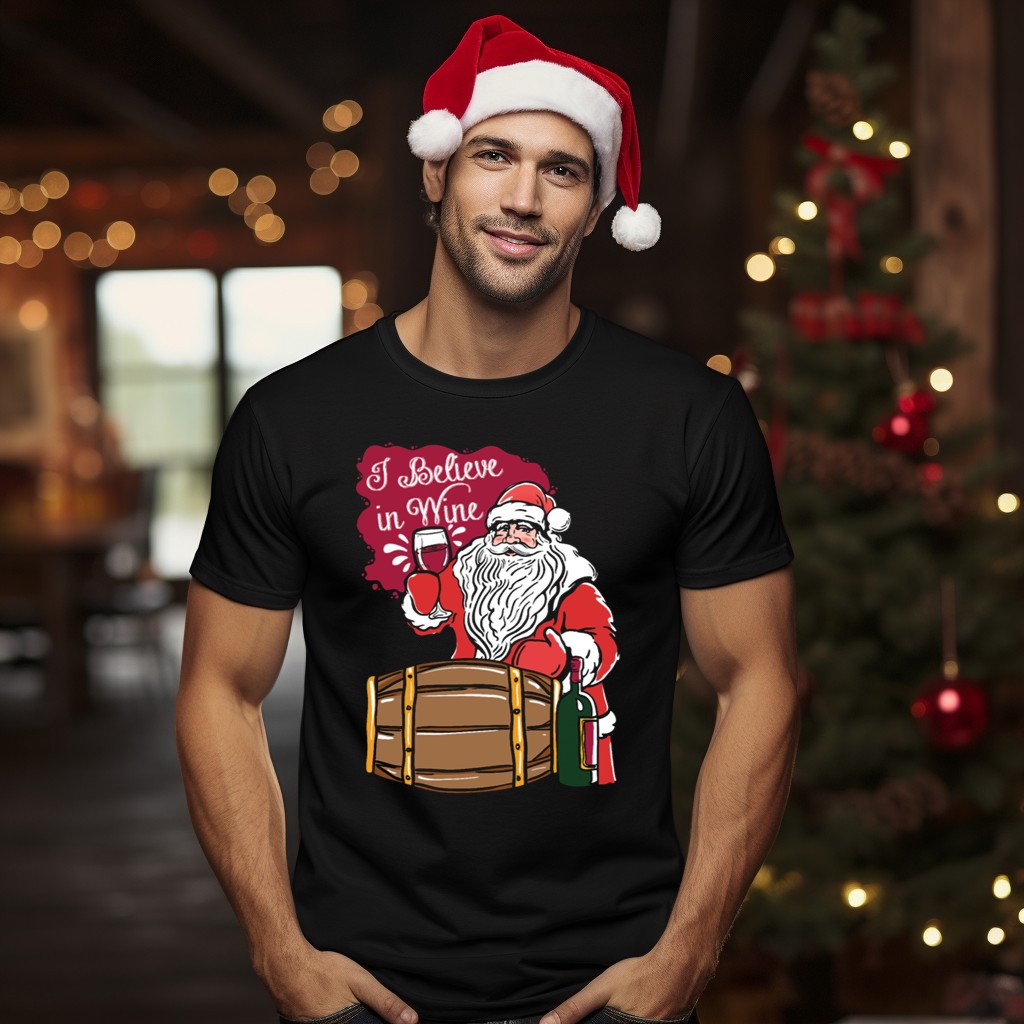 Celebrate the festive spirit with our “I Believe In Wine Santa” T-shirt, perfect for wine enthusiasts and holiday lovers alike! This fun and quirky design features a playful Santa alongside a charming wine barrel, making it an ideal choice for casual gatherings, themed events, or simply spreading holiday cheer. Made with a soft and breathable fabric, this shirt ensures you stay comfortable while showcasing your love for wine during the most wonderful time of the year.