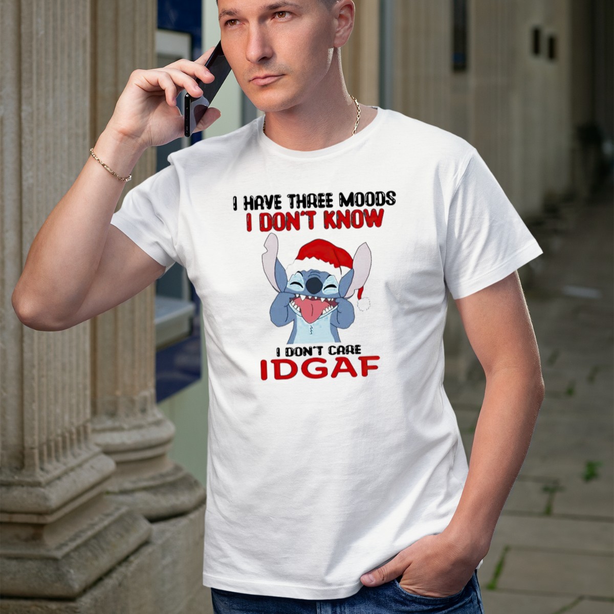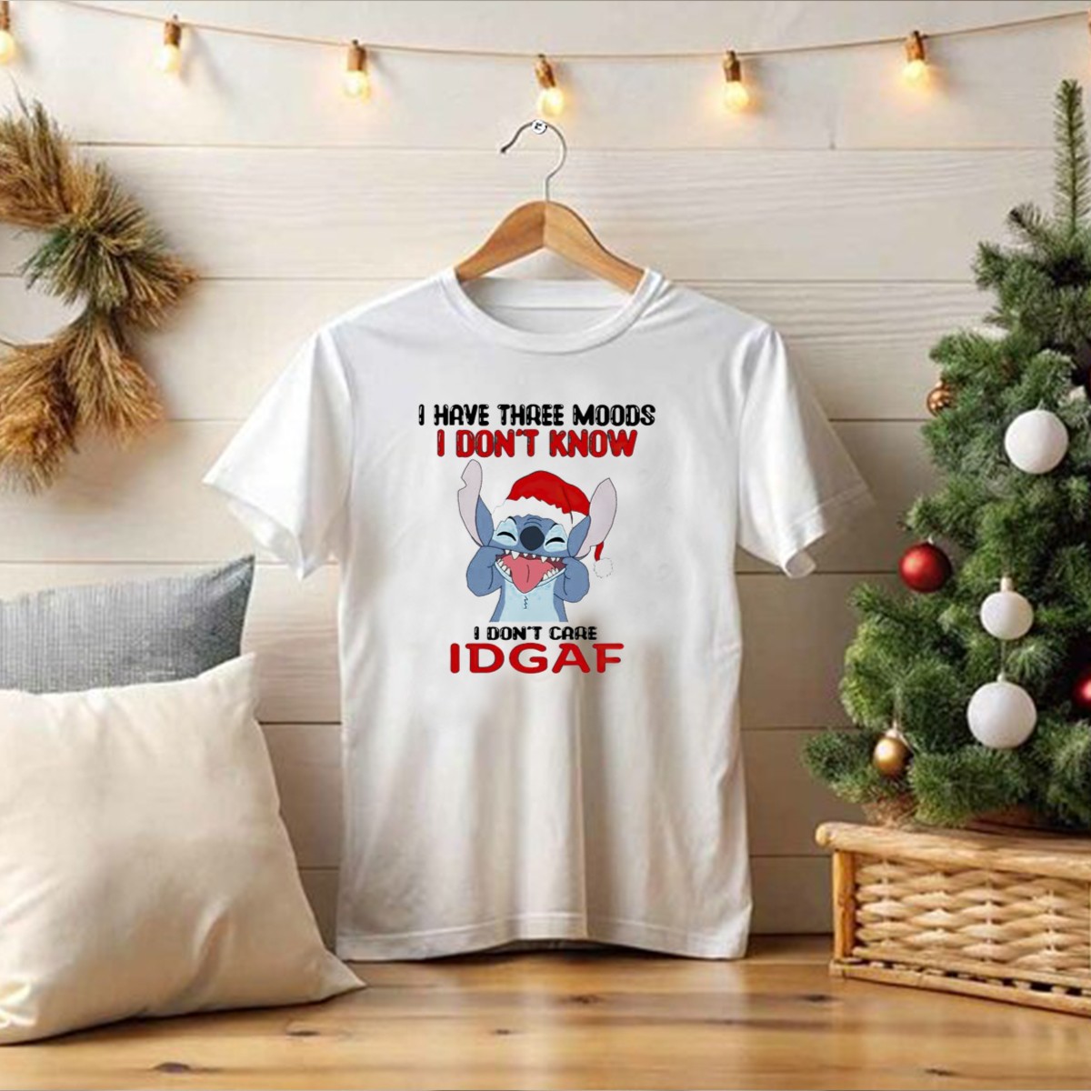 Celebrate the holiday season with a touch of humor and style in our “I Have Three Moods: I Don’t Know, I Don’t Care, IDGAF” Christmas Stitch Santa Hat T-Shirt. Perfect for those who appreciate a witty take on festive cheer, this shirt is ideal for casual gatherings, themed events, or just lounging around during the holidays. Its unique fan-made design, printed right here in the USA, adds a special flair that sets it apart from the rest.